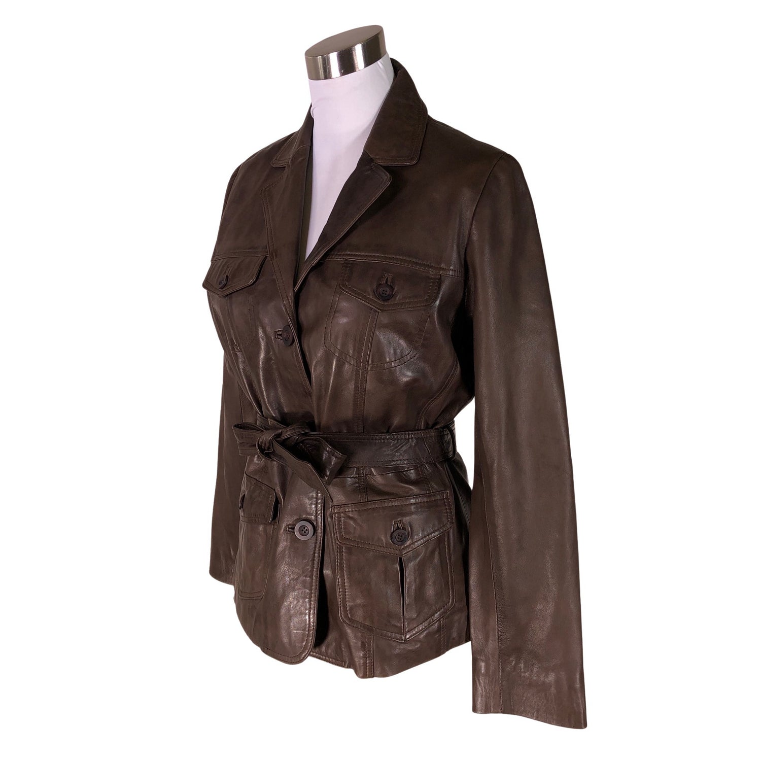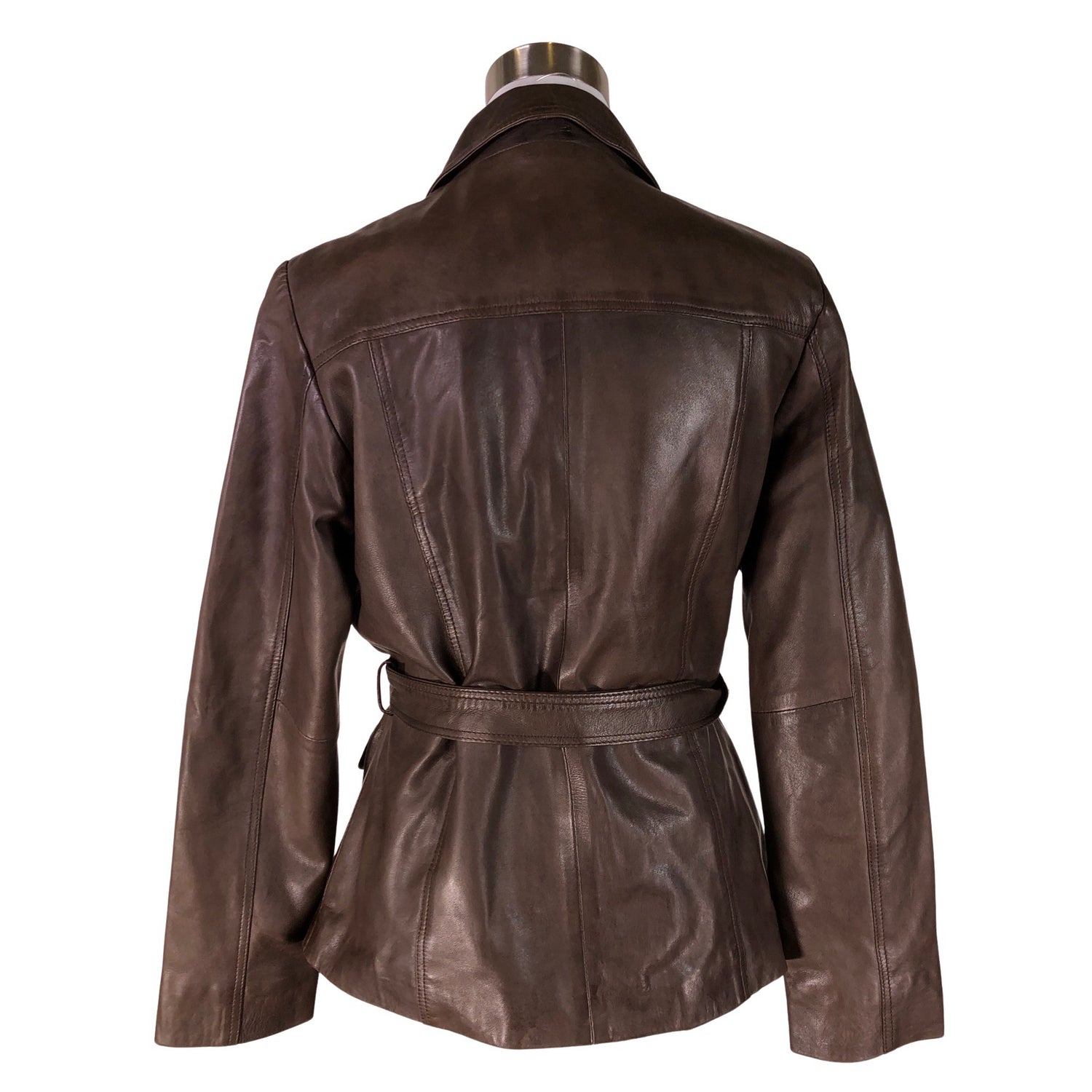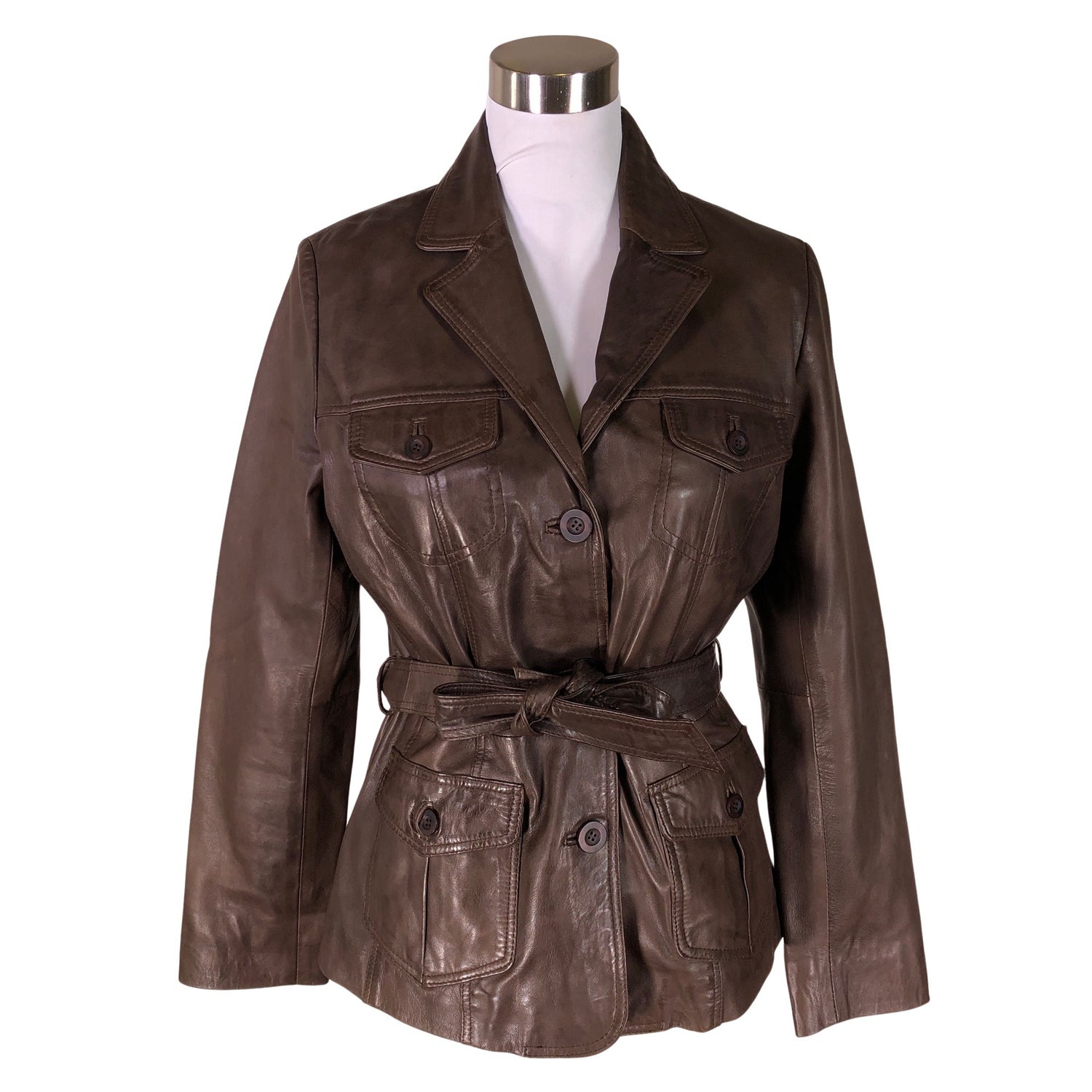 Pehmeää nahkaa. Tuotteessa on ohut vuori. Tuotteeseen kuuluu vyö. Tuotteen sisäpuolella on nukkaa. Tuotteen pinnassa on muutama tahra. Tuote on muilta osin hyvässä kunnossa.