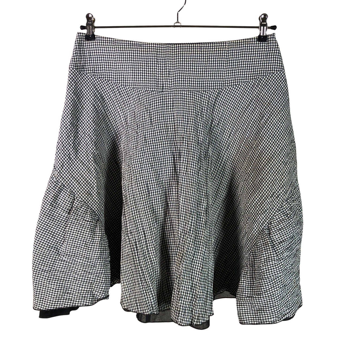 Sivusaumassa on vetoketju. Kellomainen helma. Tuotteessa on ohut vuori. Materiaali ei jousta. Tuotteen pinnassa on hieman pesu-/käyttökulumaa. Yleisilme on siisti.