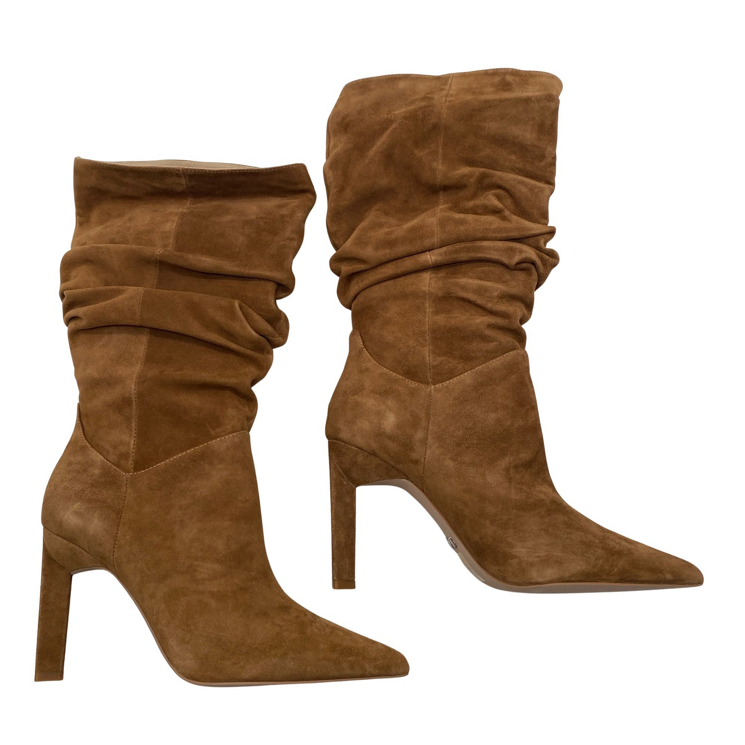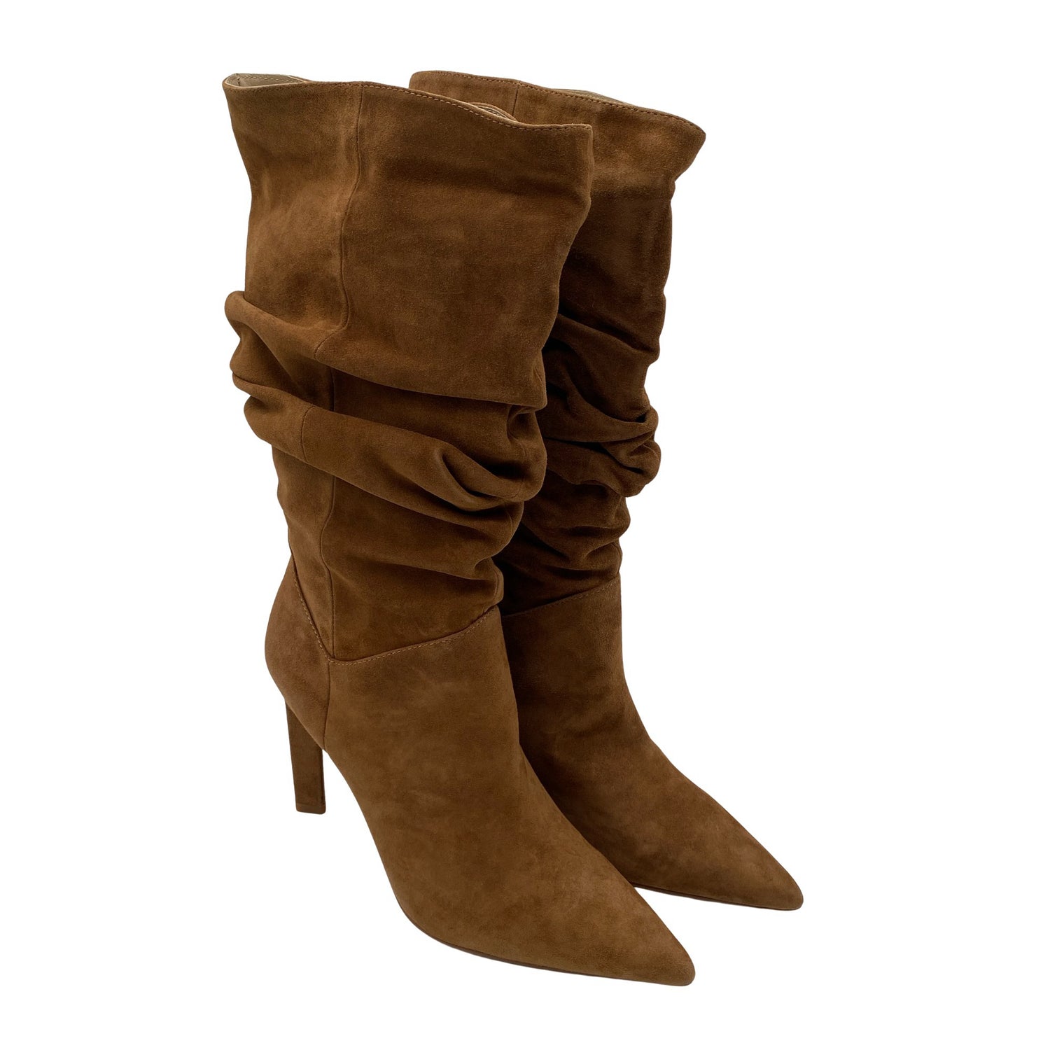 Mokkanahkaa. Korkeat korot (yli 8 cm). Malli: Suede Mid Calf Slouch Heeled Boot. Tuotteen pinnassa on aavistus pesu-/käyttökulumaa. Yleisilme on siisti.