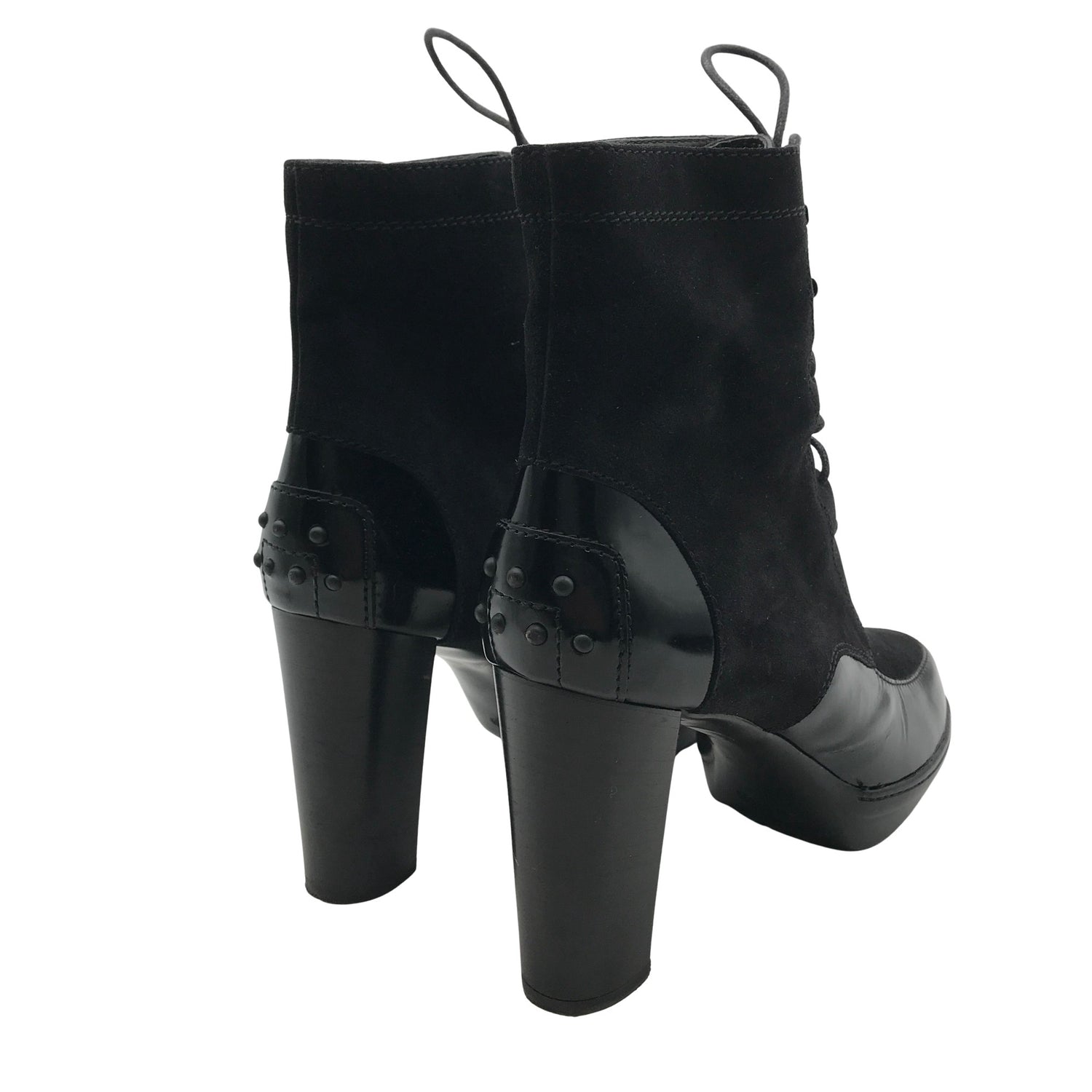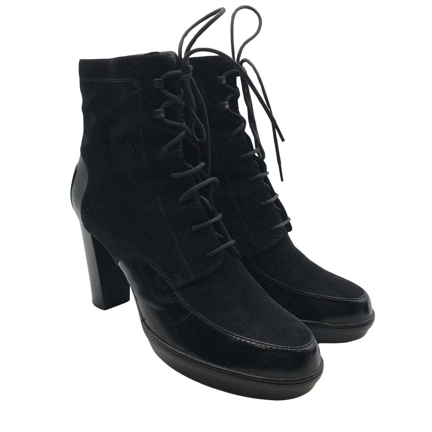 Mokkanahkaa. Korkeat korot (yli 8 cm). Solmittava malli. Mukana alkuperäinen pakkaus. Tuotteen pinnassa on aavistus pesu-/käyttökulumaa. Yleisilme on siisti.