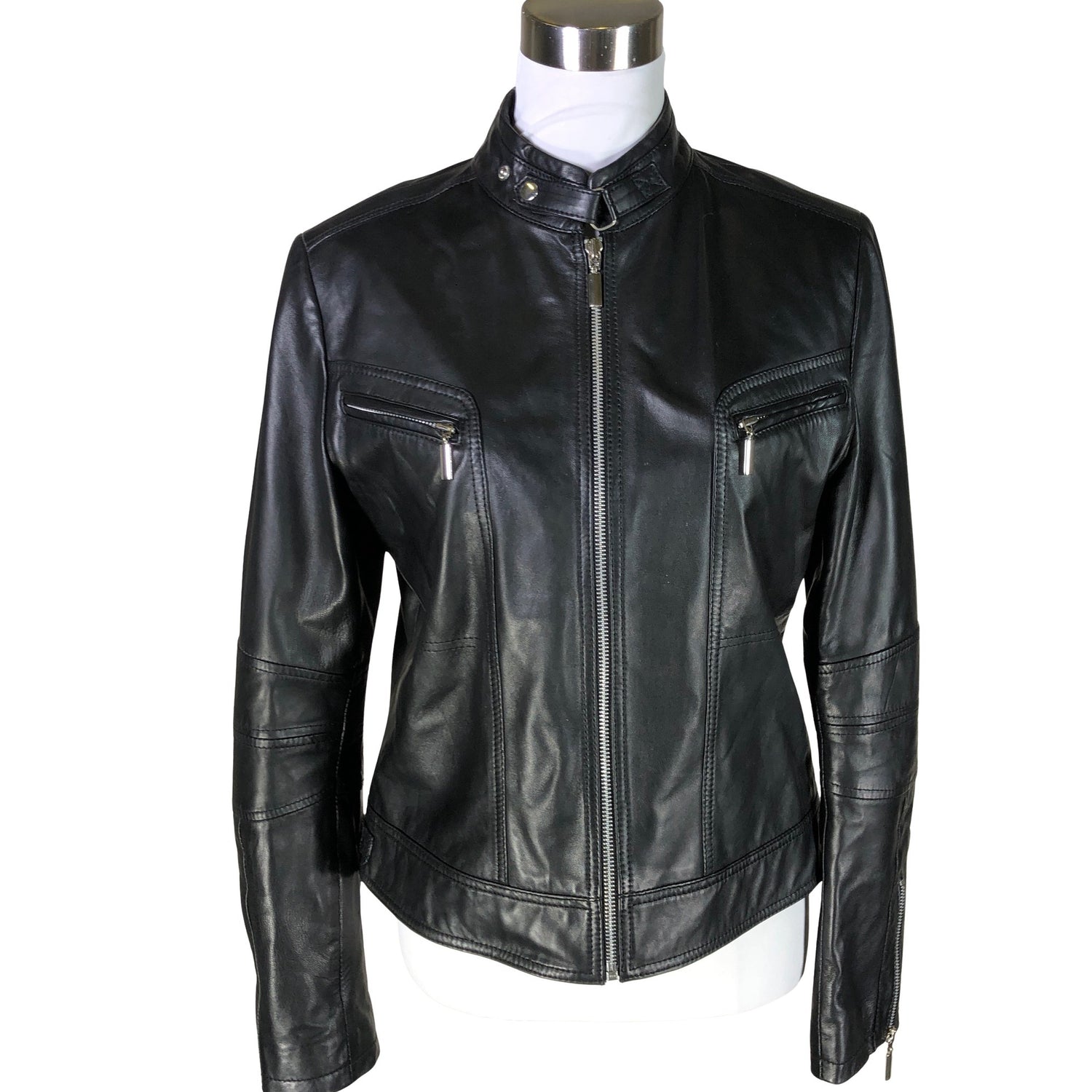 Nahkaa. Tuotteessa on ohut vuori. Hihoissa on vetoketjut. Tuotteen pinnassa on hieman pesu-/käyttökulumaa. Tuotteen pinnassa on aavistus tummentumaa. Yleisilme on siisti.