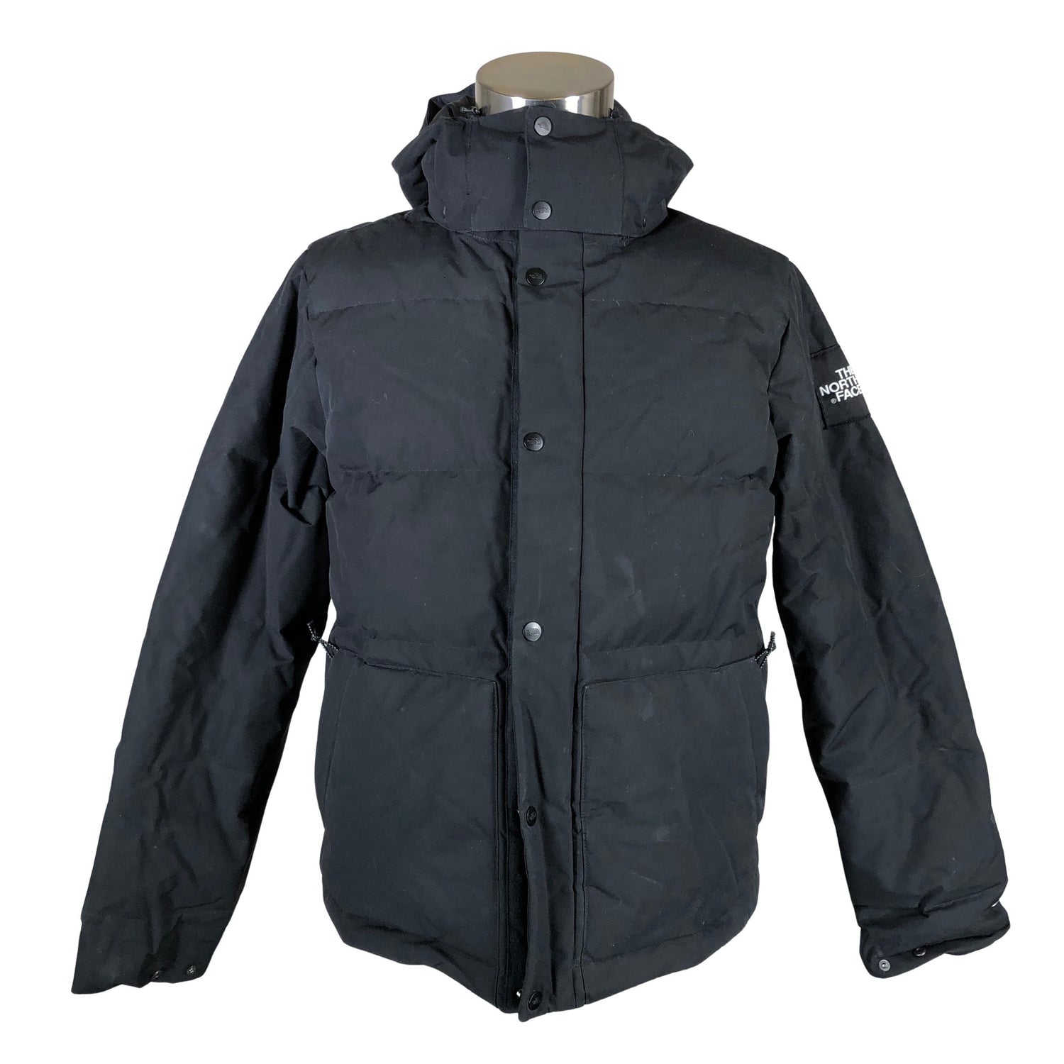 Irrotettava huppu. Tuotteen taskuissa on vetoketjut. Paksua materiaalia. Tuotteen pinnassa on hieman pesu-/käyttökulumaa. Tuotteen pinnassa on hieman tummentumaa. Tuotteen pinnassa on muutama haalea tahra. Yleisilme on siisti.