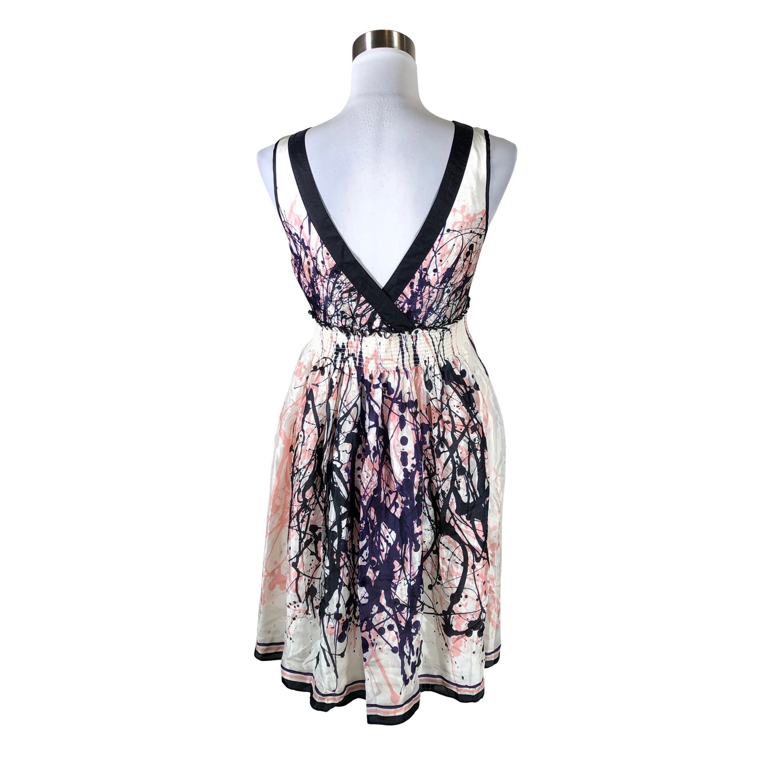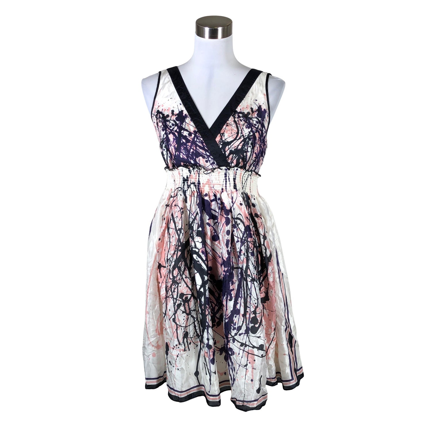 Silkkiä. Joustava vyötärö. Syvään uurrettu pääntie. Sivusaumassa on vetoketju.