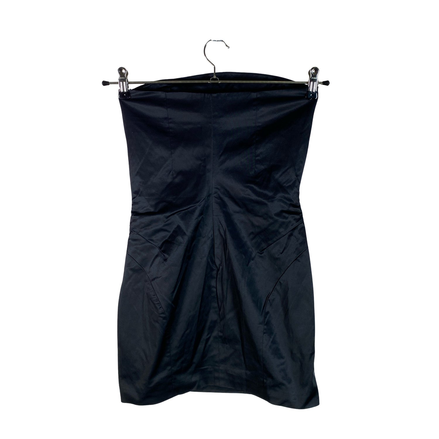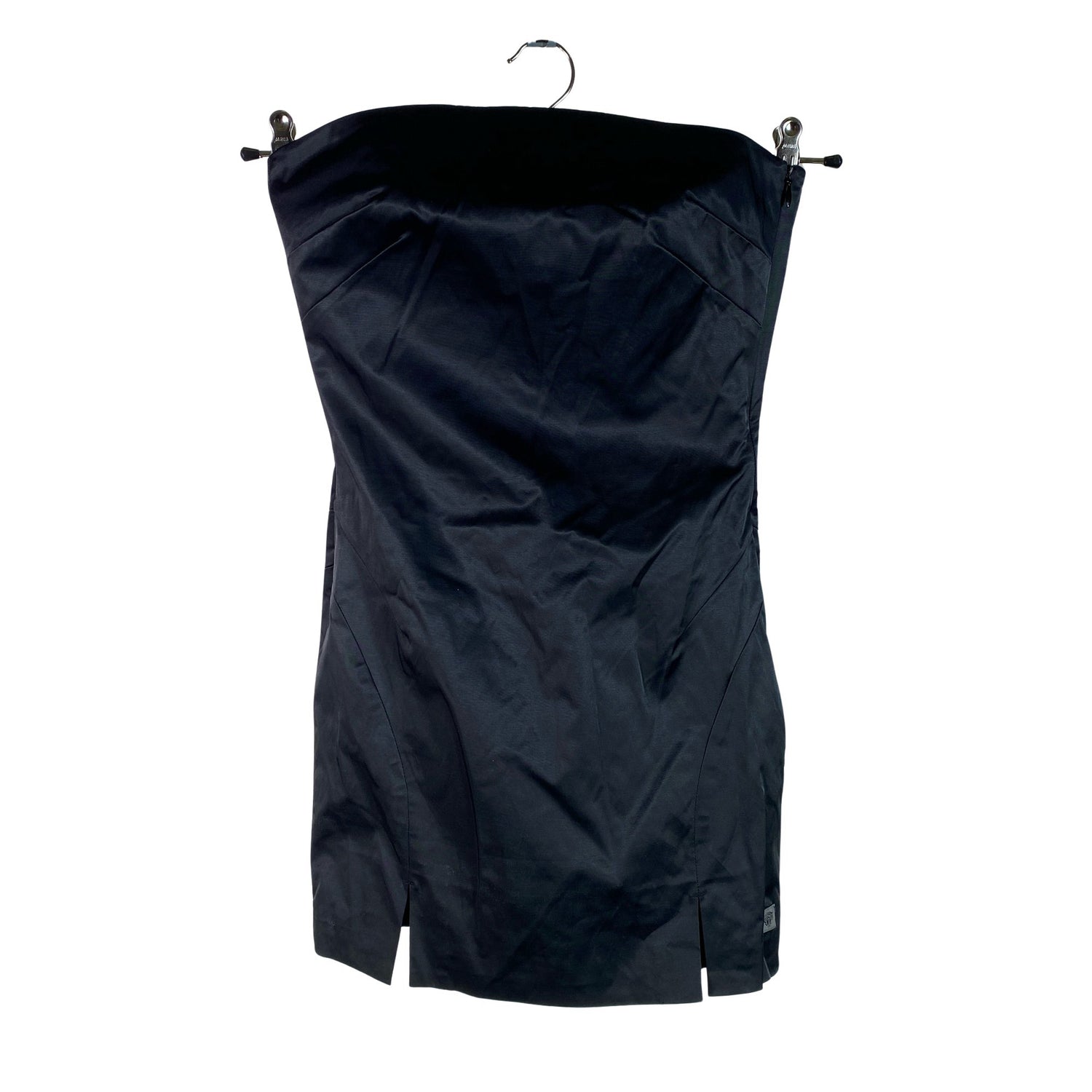 Olkaimeton malli. Lyhyt malli. Sivusaumassa on vetoketju. Tuotteessa on ohut vuori. Tuotteen pinta on kiiltävä. Irrotettavat olkaimet puuttuu. Tuote on muilta osin hyvässä kunnossa.