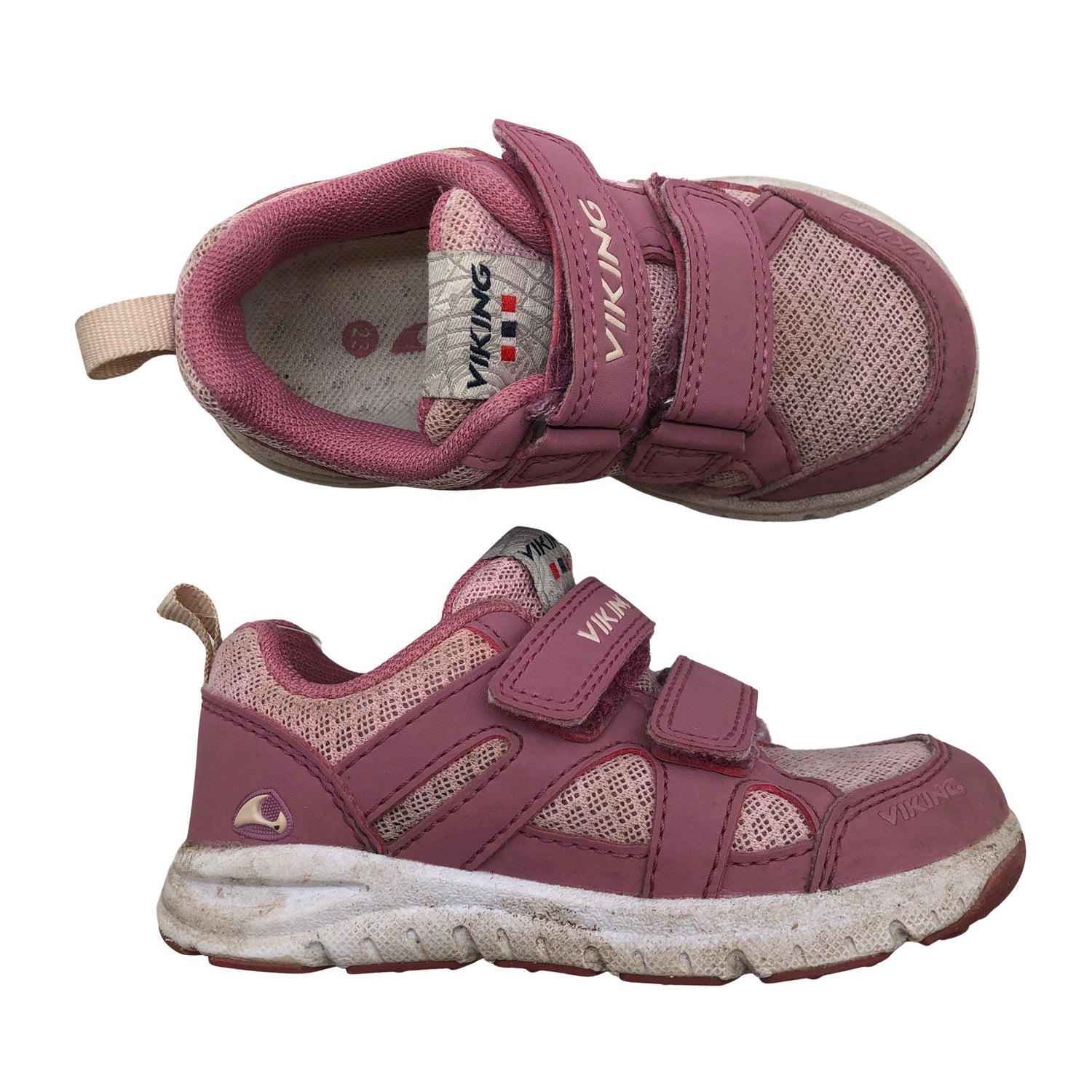Viking Lenkkarit, koko 23. Tuotteessa on tarrakiinnitys. Tuotteen pinnassa on hieman pesu-/käyttökulumaa. Tuotteen pinnassa on hieman tummentumaa. Yleisilme on siisti.