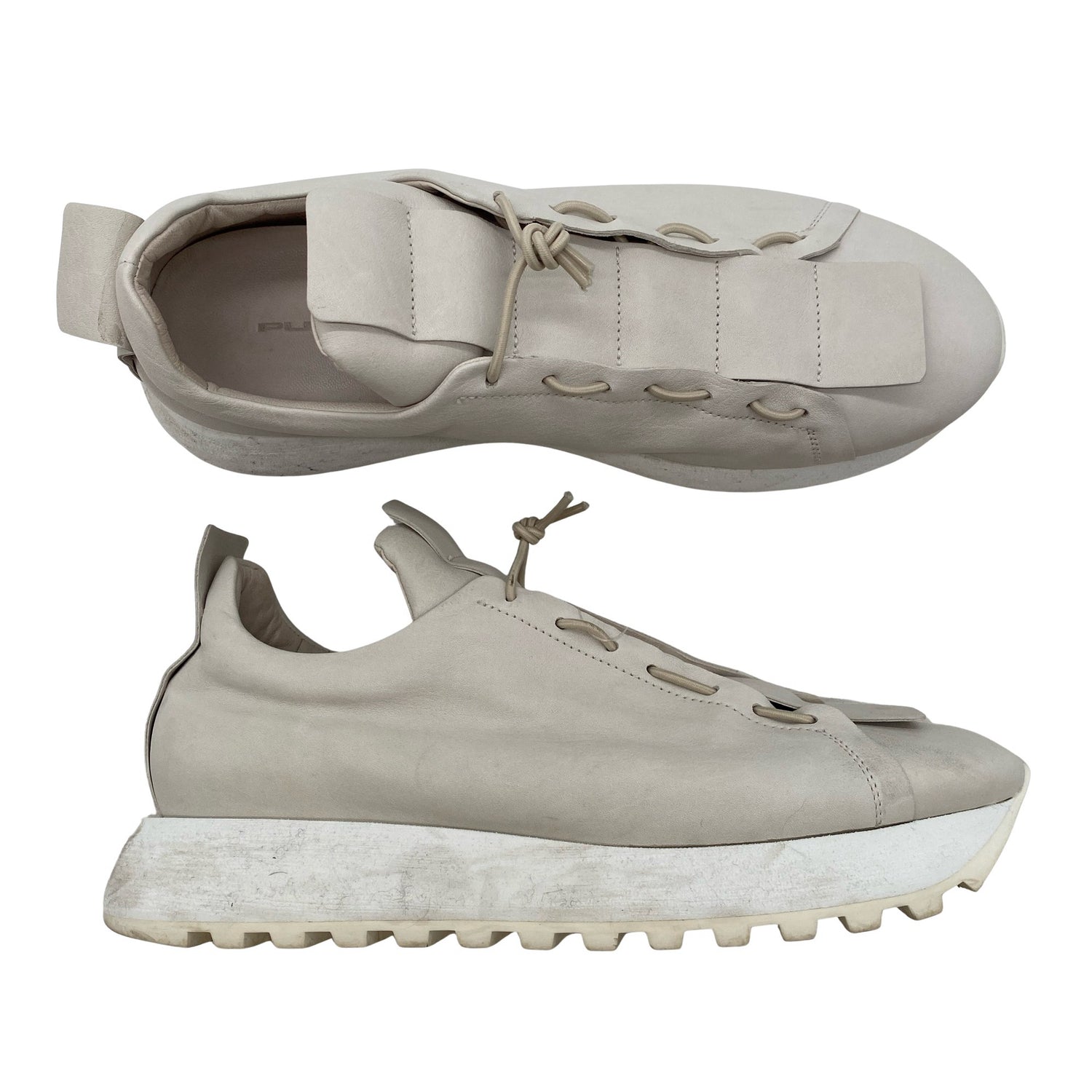 Puro Secret Tennarit, koko 39. Materiaalitieto puuttuu. Todennäköisesti nahkaa. Paksut pohjat. Tuotteen pinnassa on aavistus käyttölikaa. Lähtee todennäköisesti pesussa. Tuote on muilta osin hyvässä kunnossa.