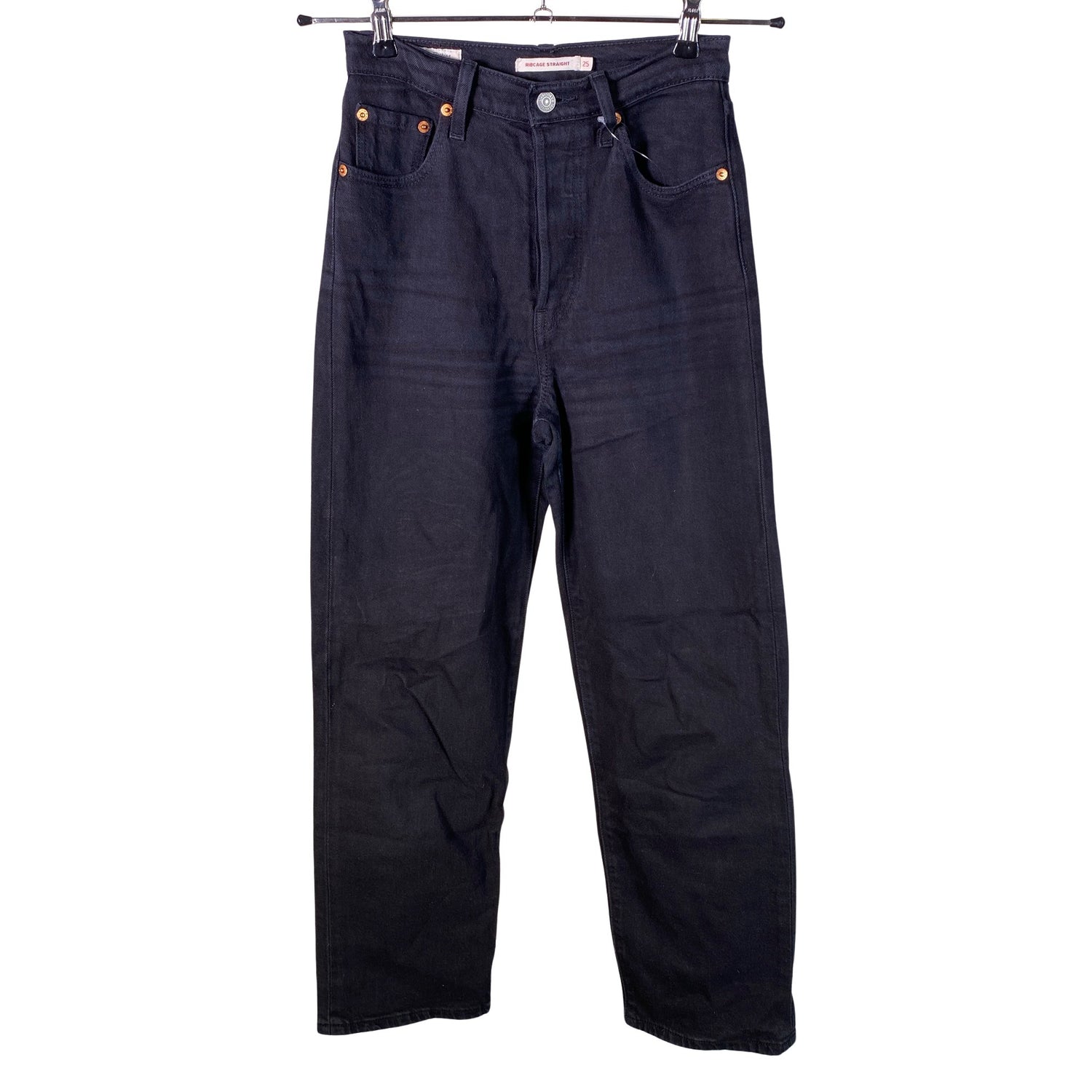 Malli: Ribcage straight. Korkea vyötärö. Edessä napit. Materiaali ei jousta. Tuotteen pinnassa on hieman pesu-/käyttökulumaa. Yleisilme on siisti.