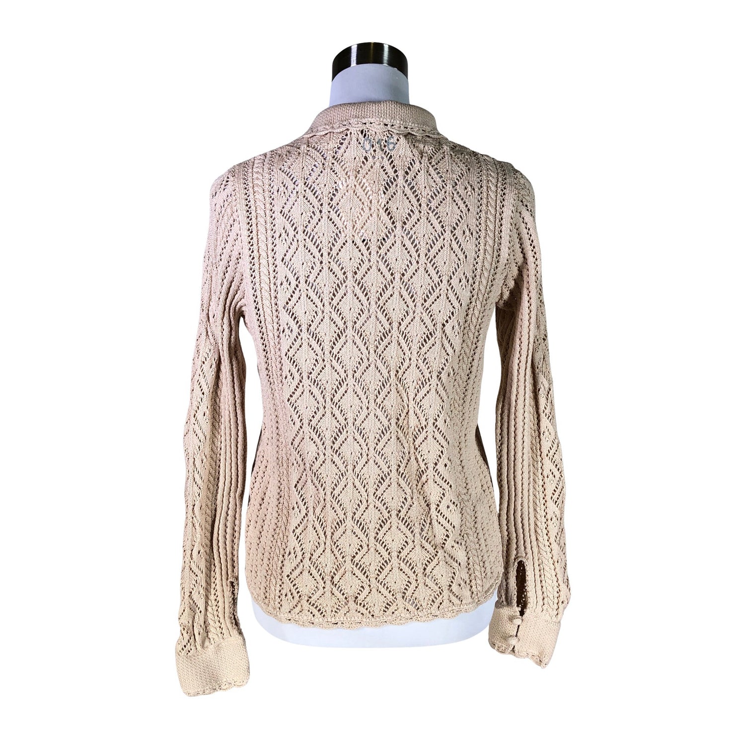 Luomupuuvillaa. Harvaa neulosta. Materiaali joustaa hieman. Edessä napit.