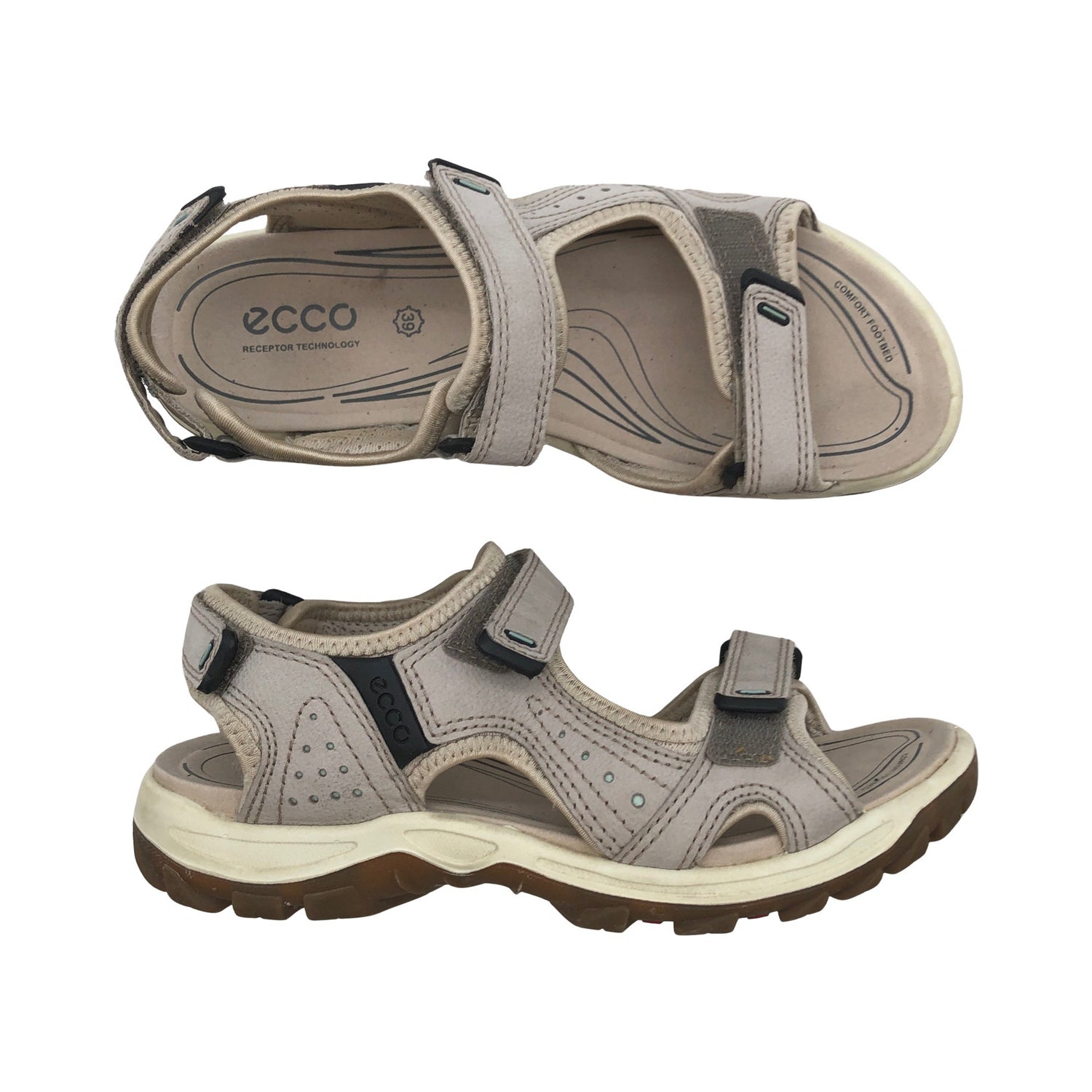 Ecco Sandaalit, koko 39. Nahkaa. Tuotteessa on tarrakiinnitys. Tuotteen sisäpuolella on aavistus käyttölikaa. Tuotteen pinnassa on aavistus pesu-/käyttökulumaa. Tuote on muilta osin hyvässä kunnossa.