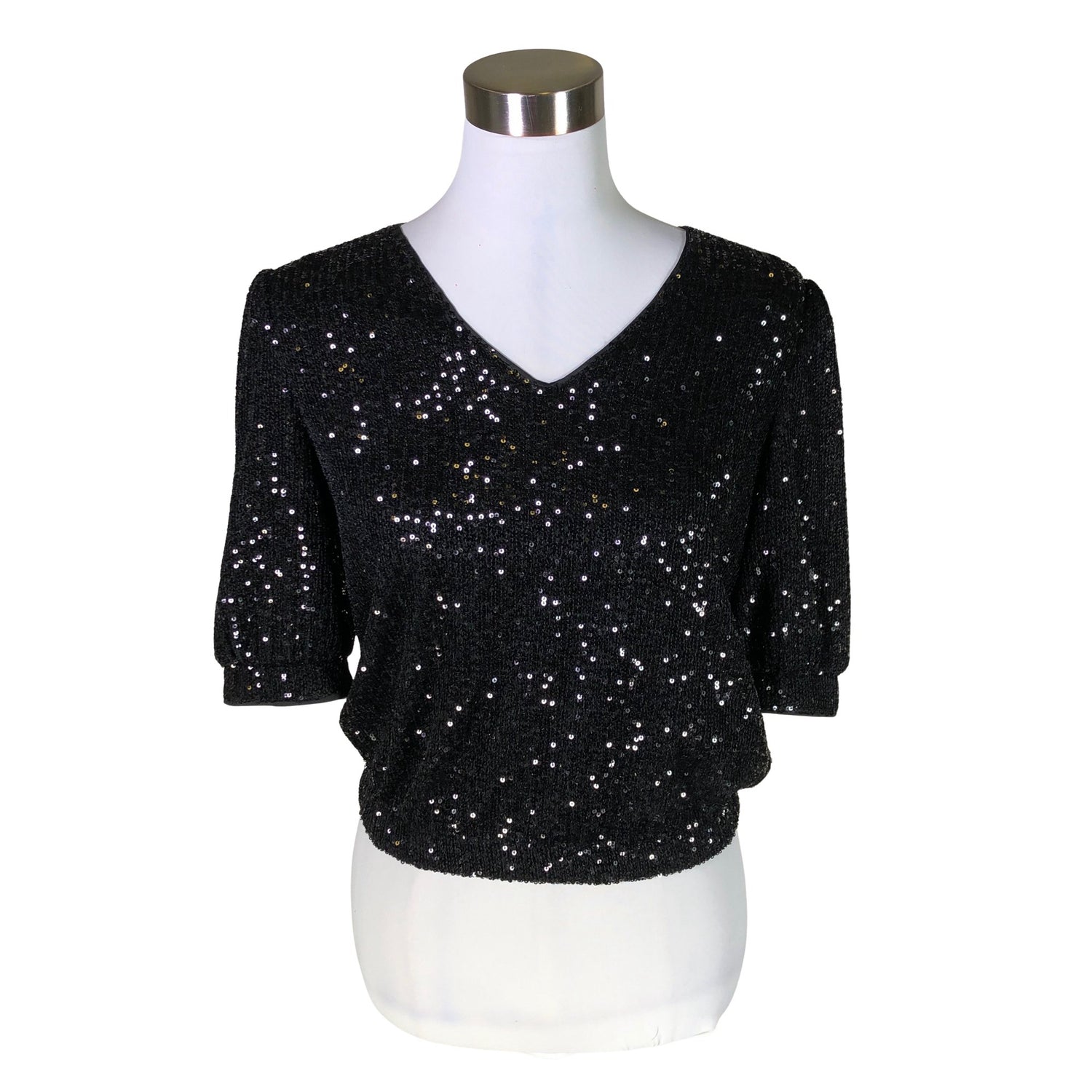 Paljettipinta. Helmassa on kuminauha.