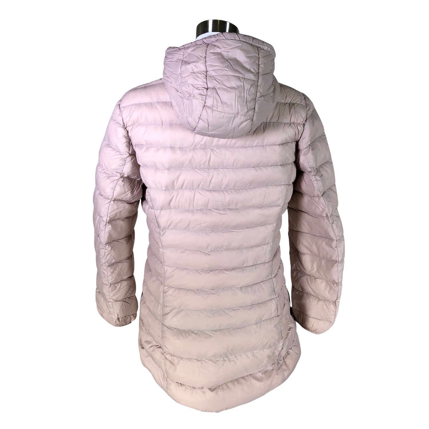 Tuotteessa on kaksisuuntainen vetoketju. Tuotteessa on huppu. Untuvat/toppaus on hieman kasassa. Tuotteen pinnassa on haalea tahra. Tuote on muilta osin hyvässä kunnossa.