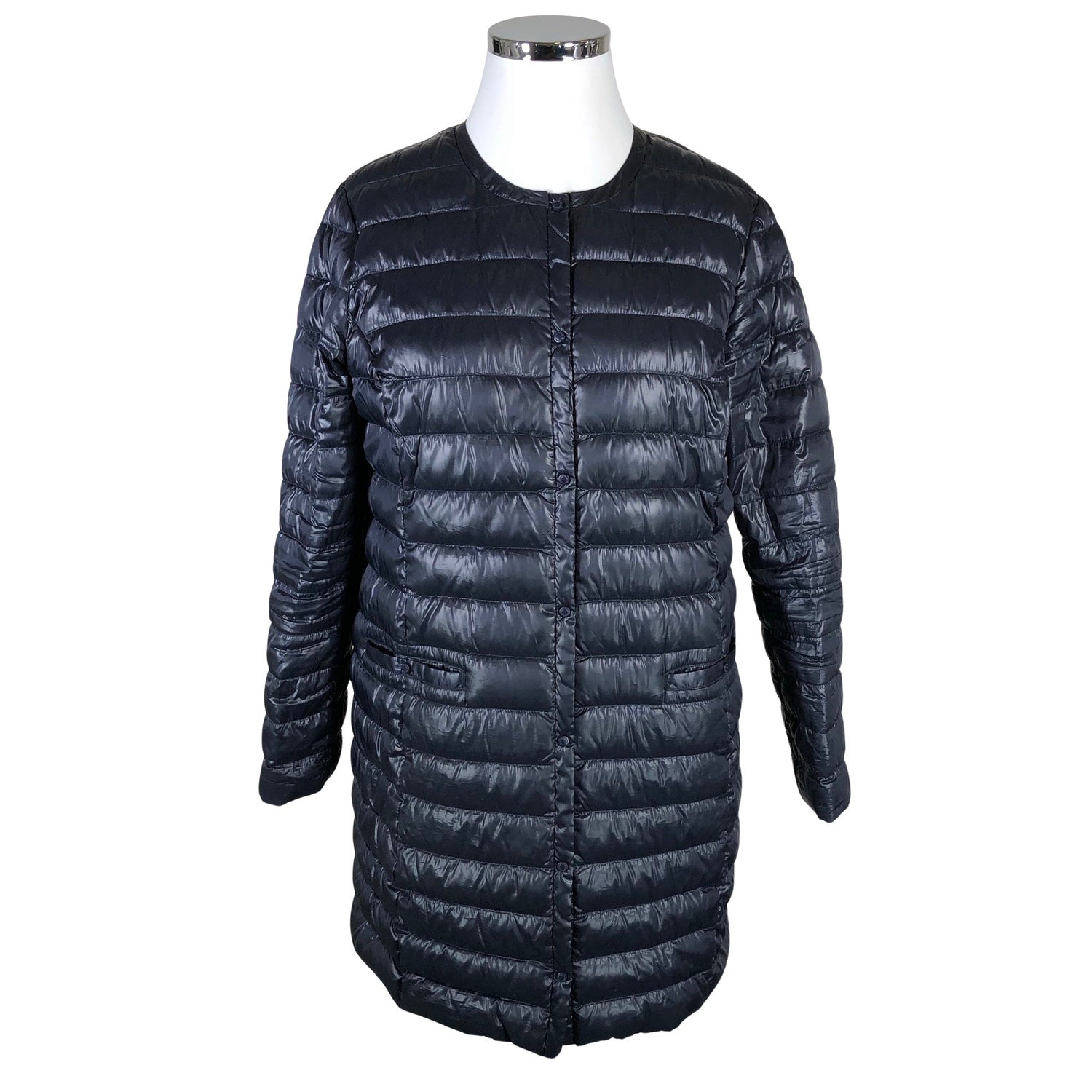 Pitkä malli. Vaatteessa on taskut. Tuotteen pinnassa on aavistus pesu-/käyttökulumaa. Toppaus on hieman kasassa. Yleisilme on siisti.