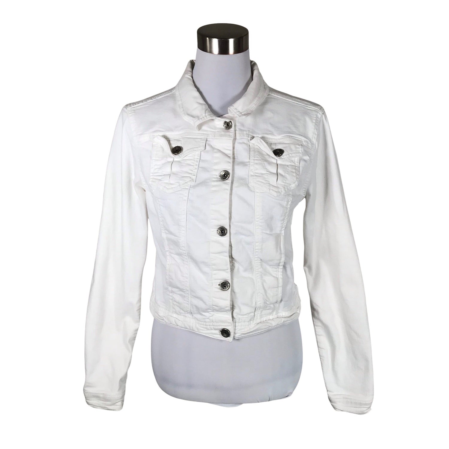 Materiaali joustaa. Edessä napit. Tuotteen pinnassa on hieman pesu-/käyttökulumaa. Tuotteen pinnassa on aavistus tummentumaa. Yleisilme on siisti.