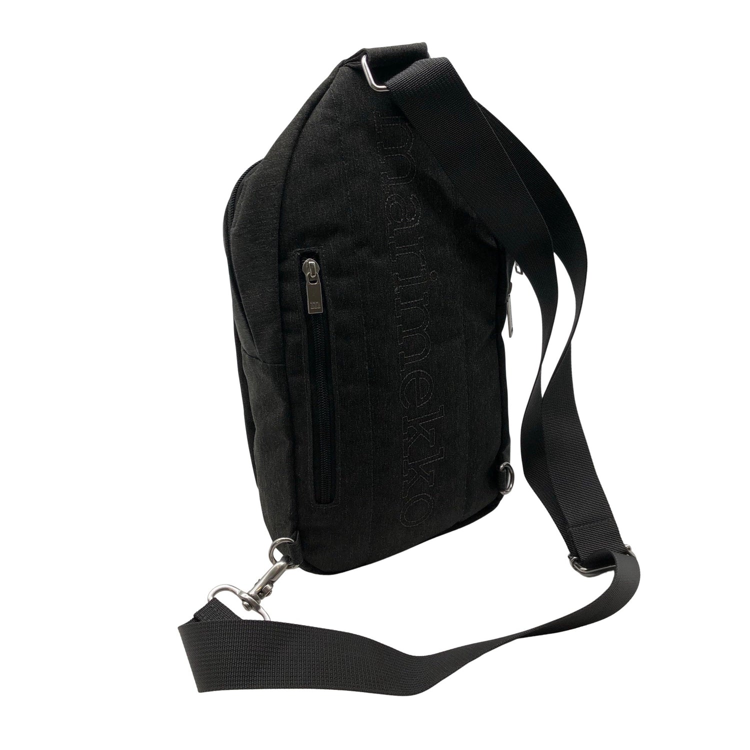 Crossbody. Olkahihnan pituus on säädettävissä. Tuotteen pinnassa on aavistus pesu-/käyttökulumaa. Yleisilme on siisti.