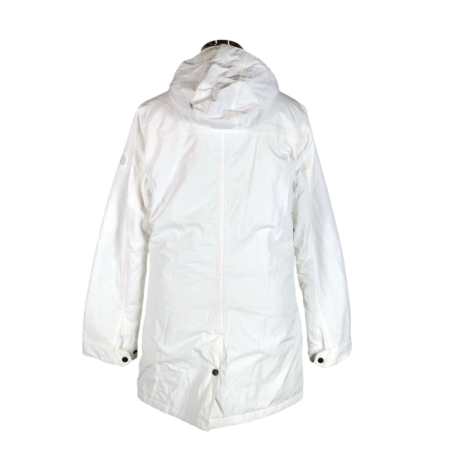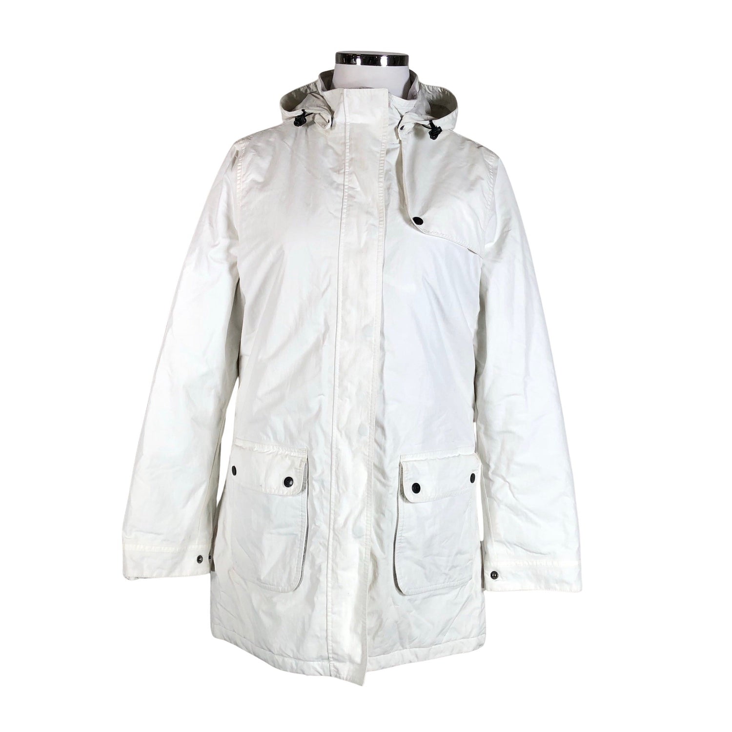 Korkea kaulus. Irrotettava huppu. Vaatteessa on taskut. Tuotteen pinnassa on hieman pesu-/käyttökulumaa. Yleisilme on siisti.