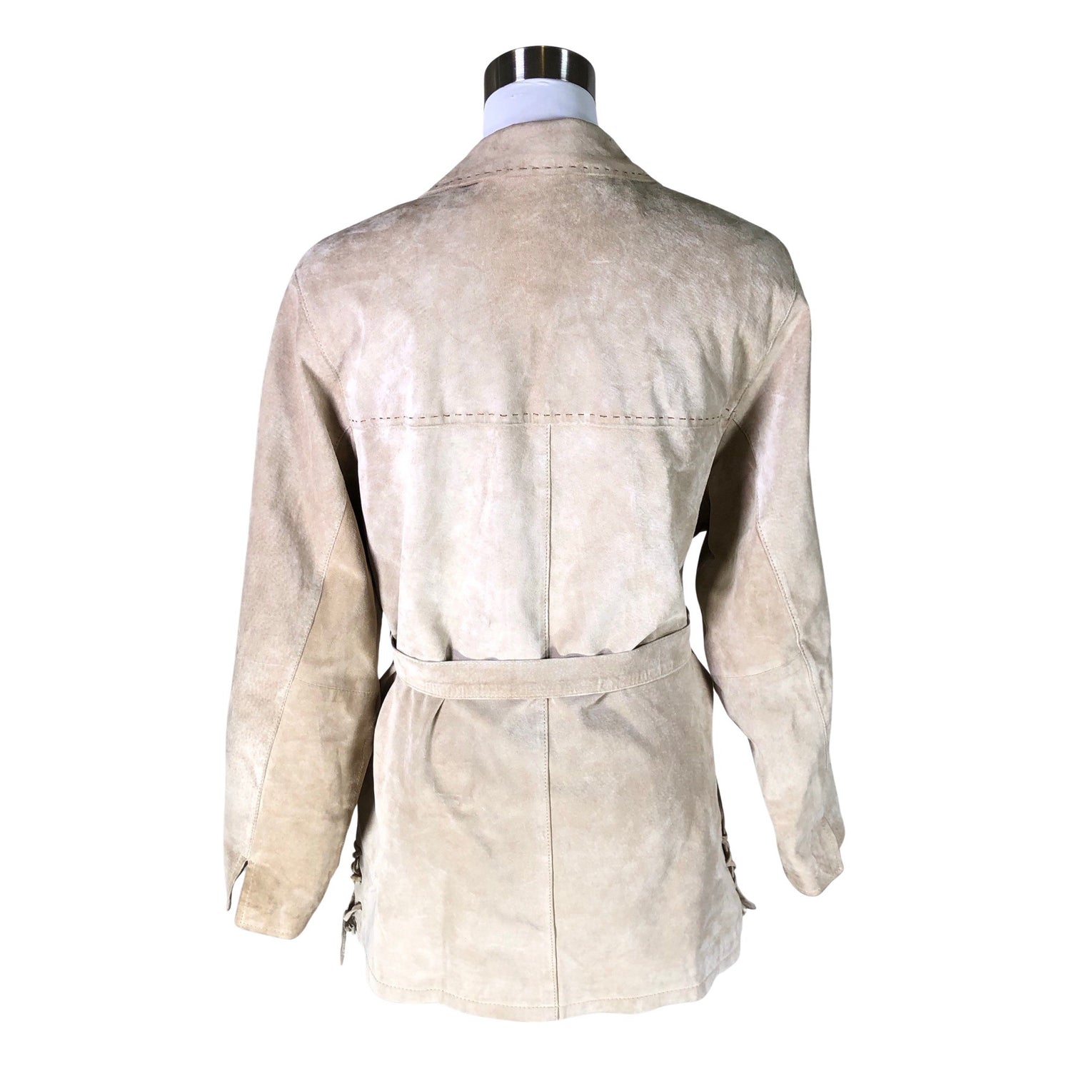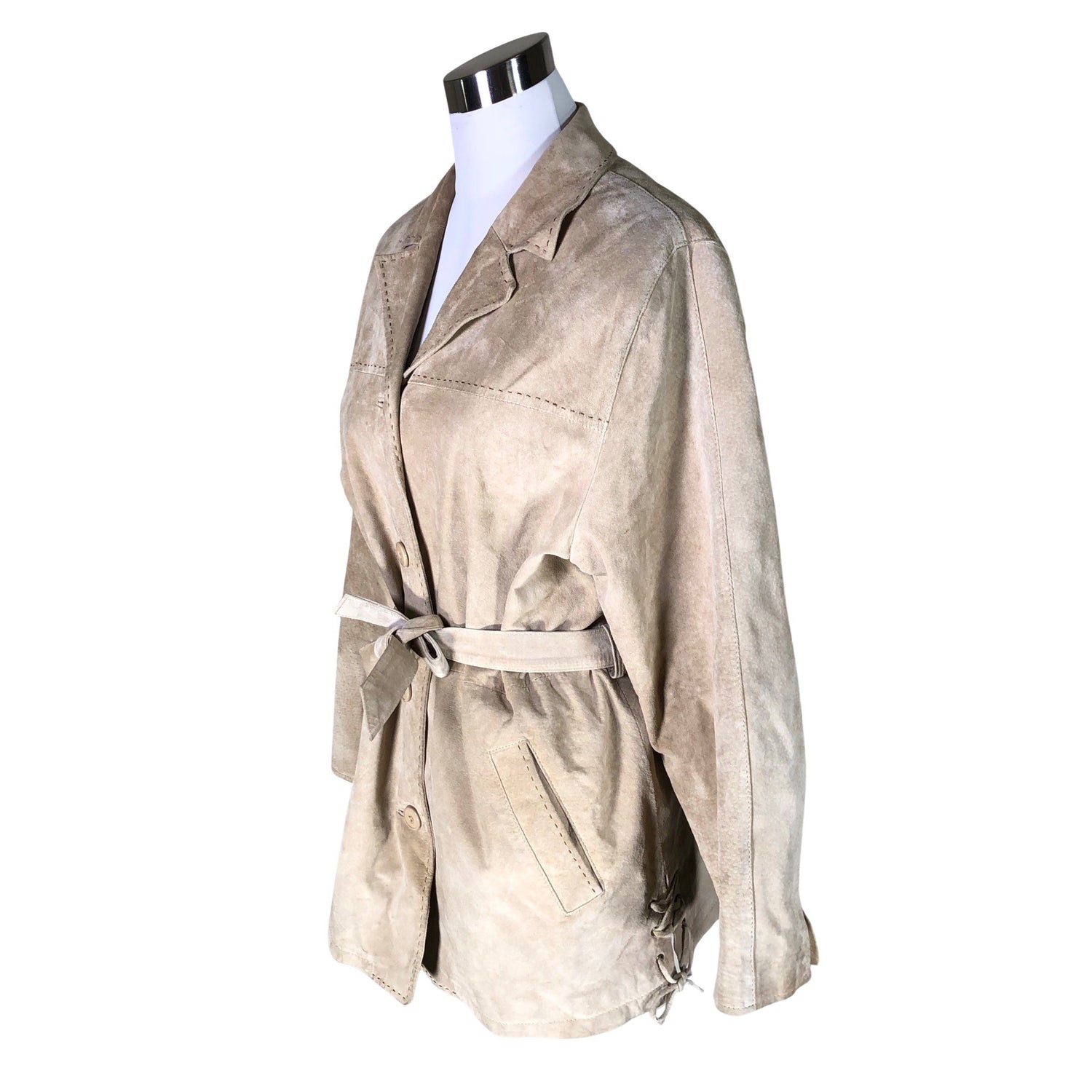 Mokkanahkaa. Tuotteeseen kuuluu vyö. Väljä malli. Tuotteen pinnassa on hieman tummentumaa. Tuotteen pinnassa on hieman pesu-/käyttökulumaa. Tuotteen pinnassa on muutama tahra. Yleisilme on siisti.