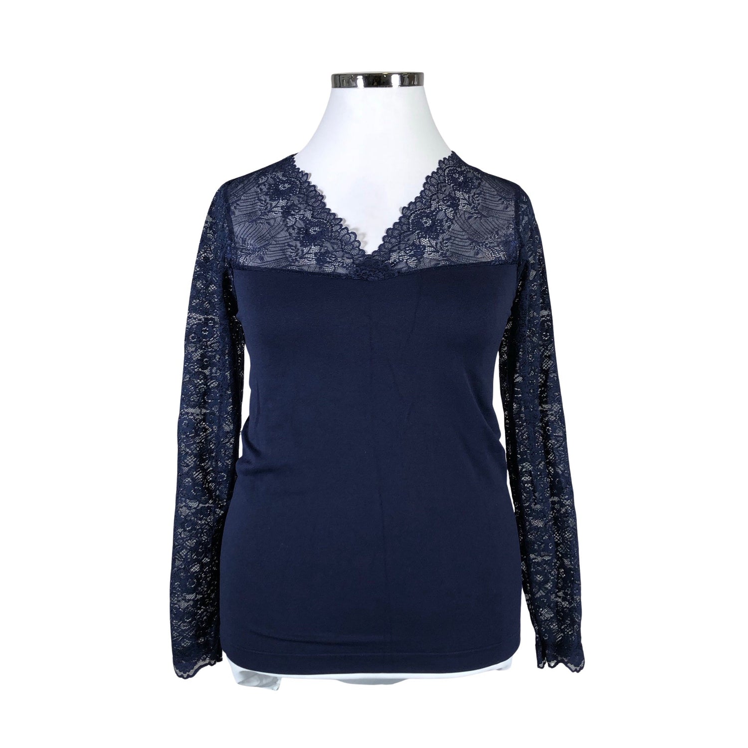 Malli: Vanessa V-Neck. Tuote on osin pitsiä. Tyköistuva malli. Materiaali on hyvin joustavaa. Tuotteen pinnassa on hieman pesu-/käyttökulumaa. Tuotteen pinnassa on hieman nukkaa. Yleisilme on siisti.