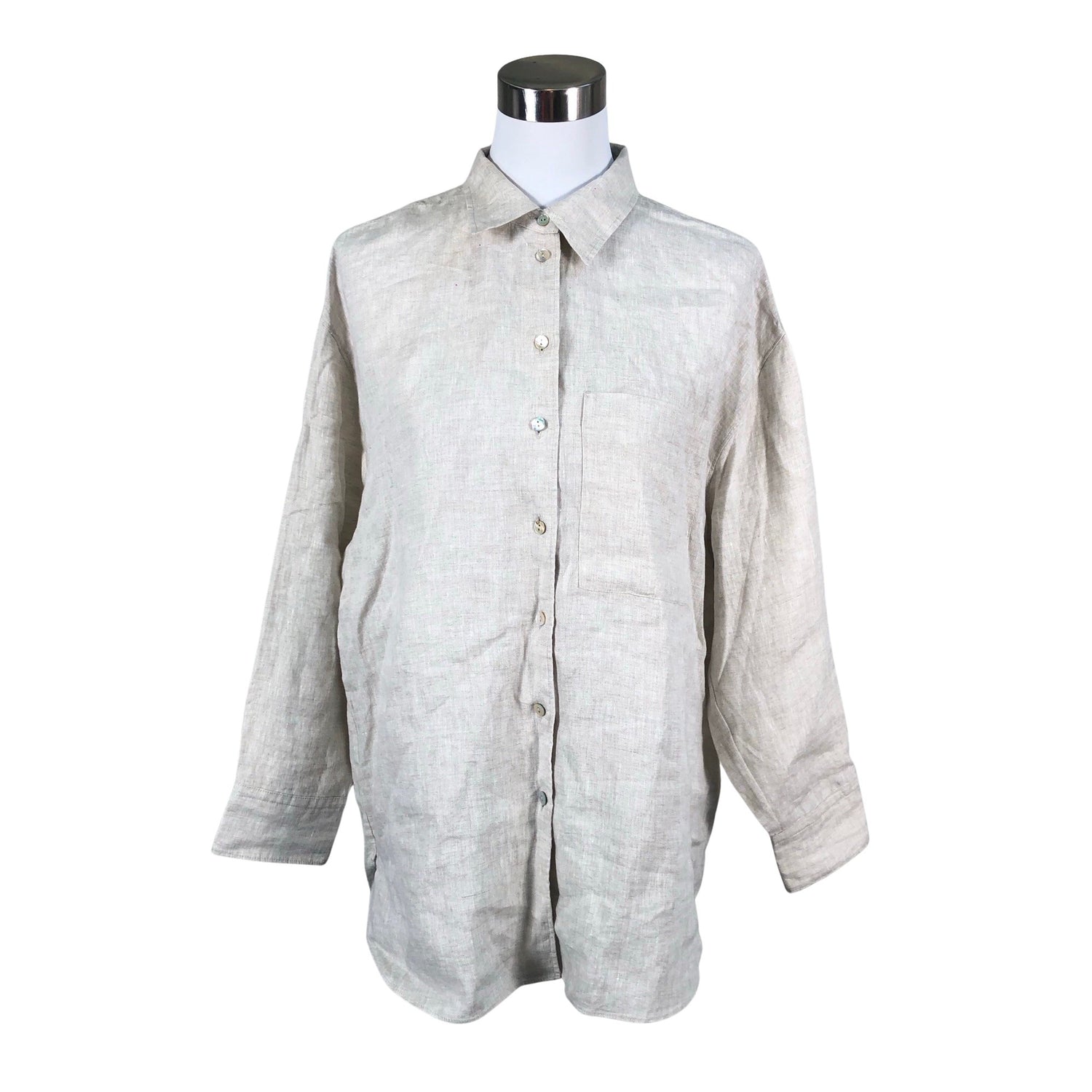 Pellavaa. Edessä napit. Takaa pidempi malli.