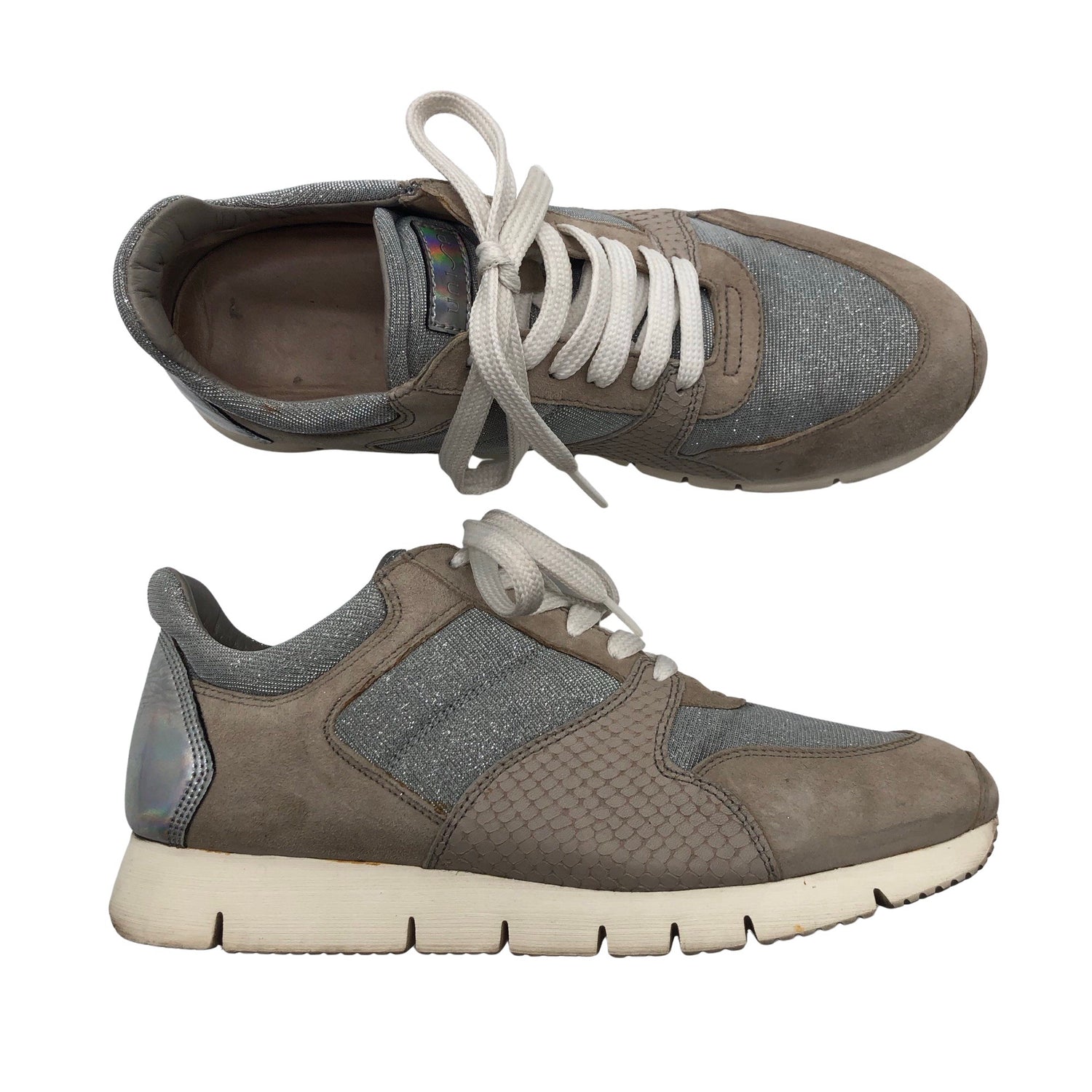 Paksut pohjat. Tuotteen pinnassa on kimalletta. Mukana alkuperäinen pakkaus. Tuotteen pinnassa on aavistus käyttölikaa. Tuote on muilta osin hyvässä kunnossa.
