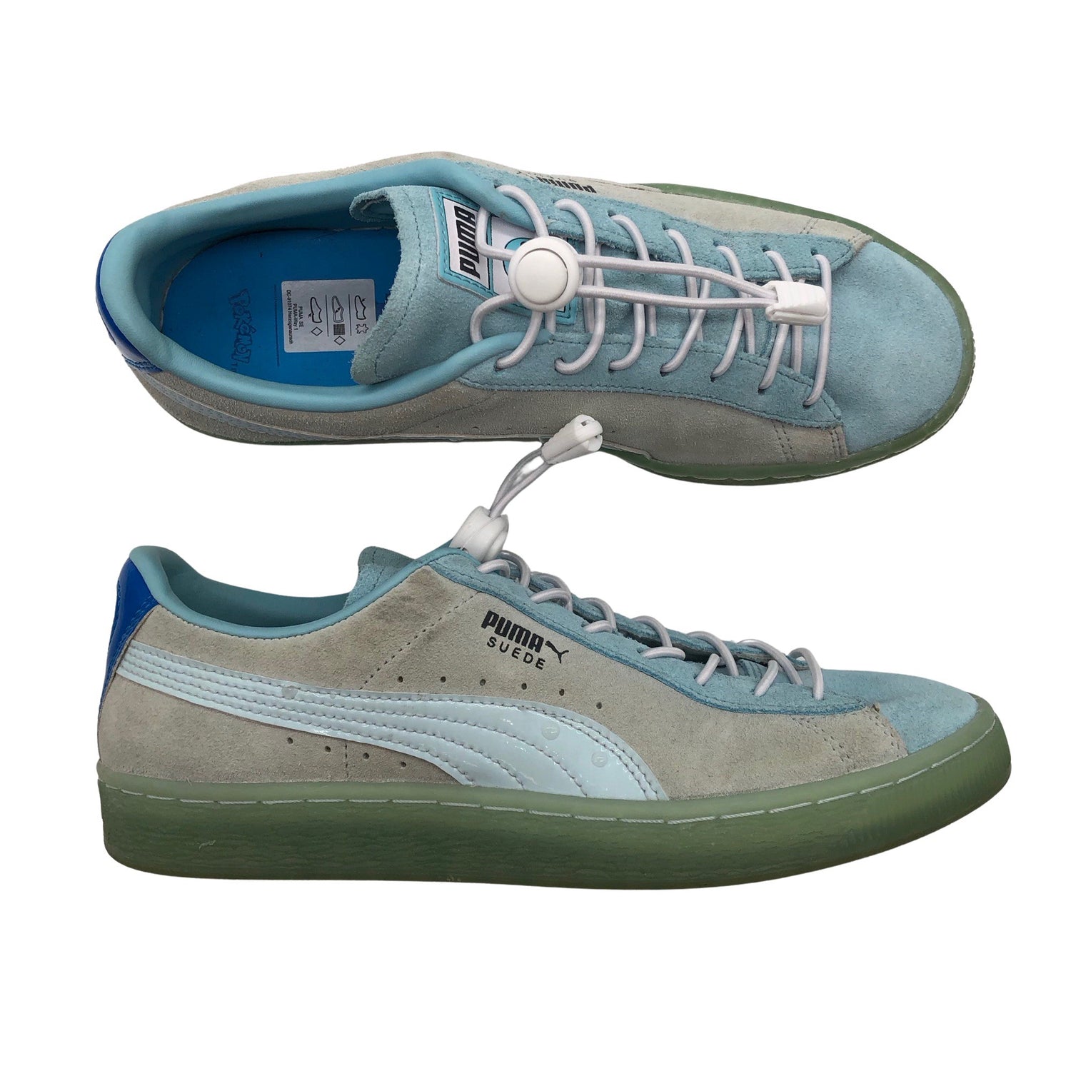 Malli: Suede. Mallisto: Puma x Pokemon. Mokkanahkaa. Tuotteen sisäpuolella on hieman käyttölikaa. Lähtee todennäköisesti pesussa. Tuote on muilta osin hyvässä kunnossa.