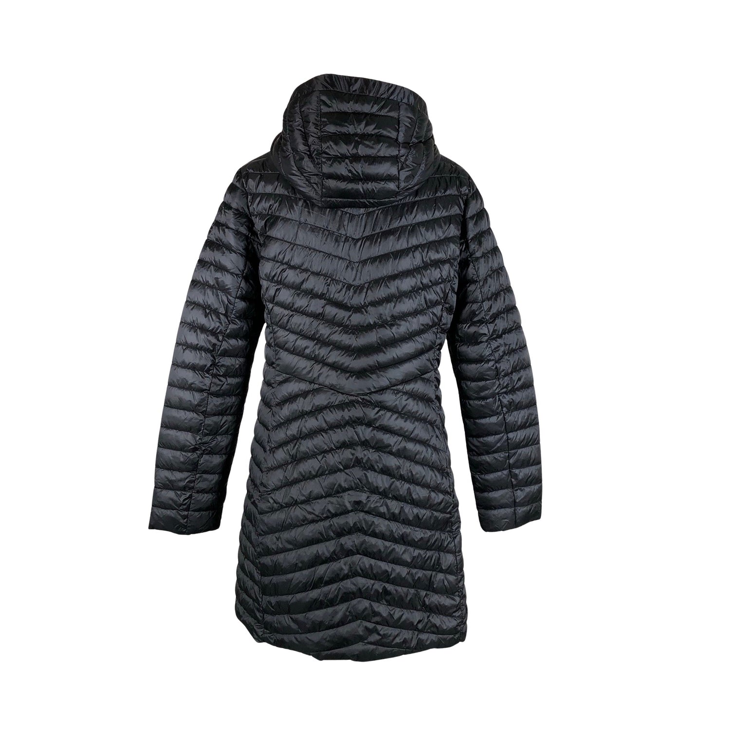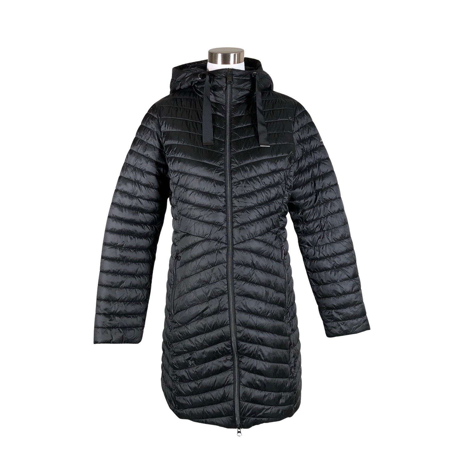 Pitkä malli. Korkea kaulus. Tuotteen taskuissa on vetoketjut.