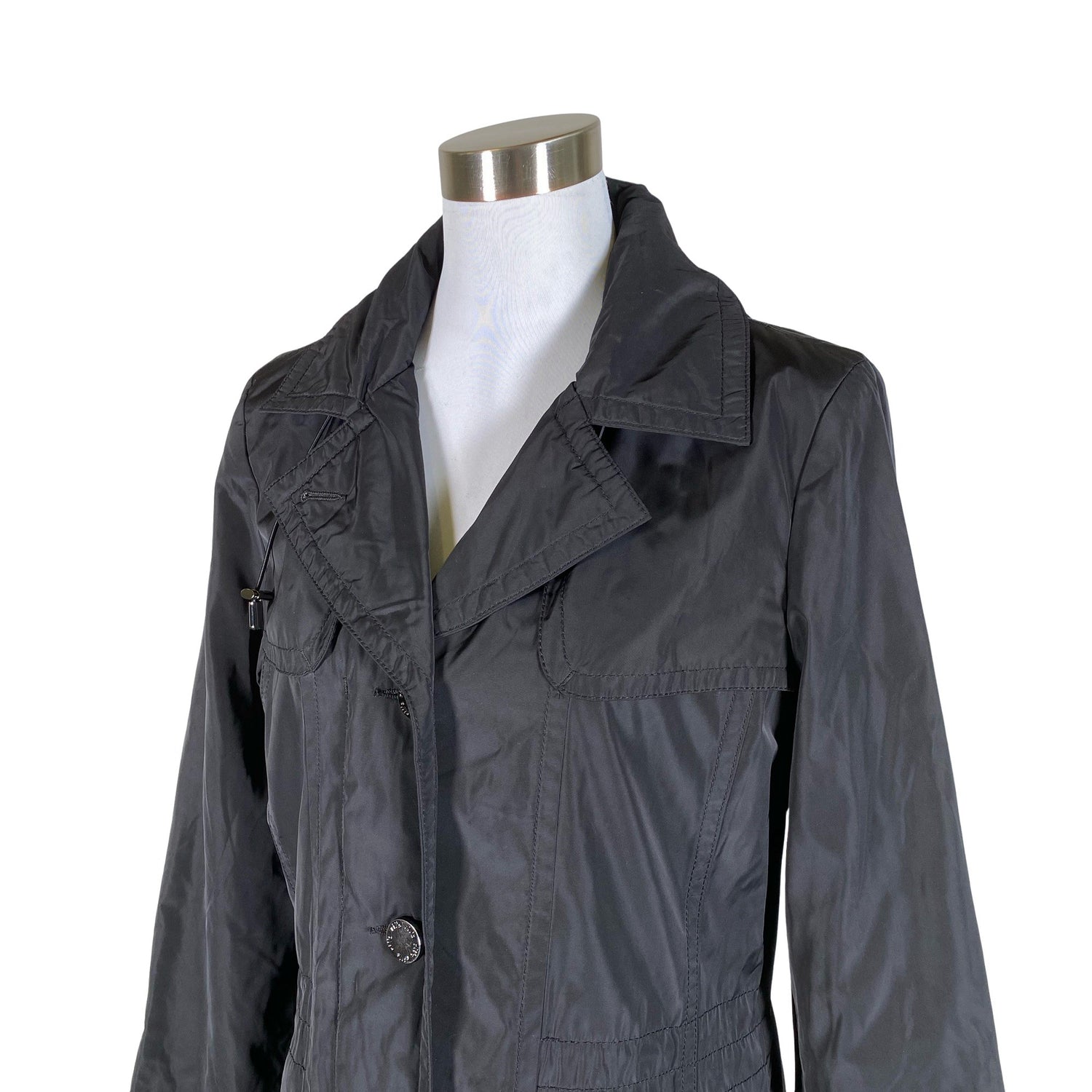 Kiristysnauha vyötäröllä. Tuotteessa on ohut vuori. Irrotettava huppu. Kauluksessa on hieman kulumaa. Tuote on muilta osin hyvässä kunnossa.