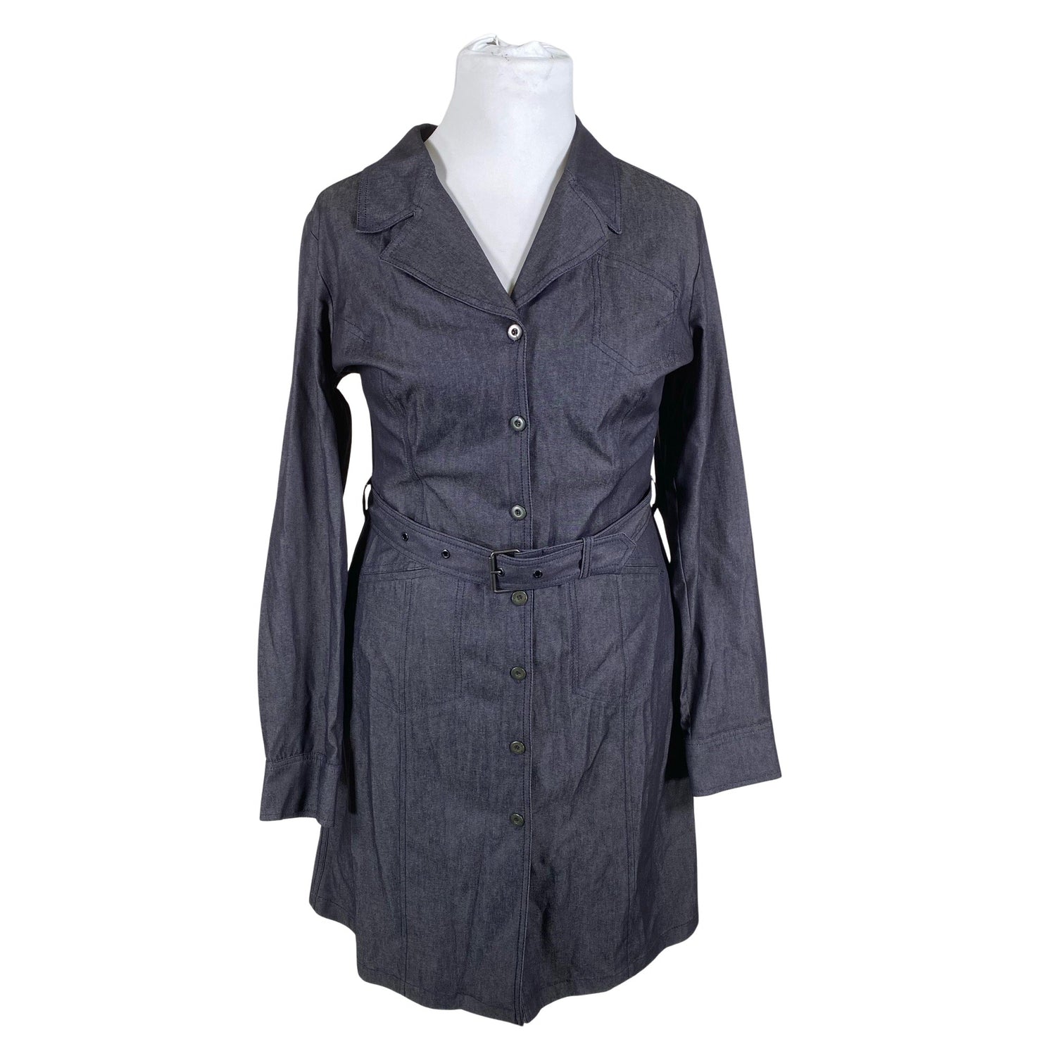 Edessä napit. Tuotteeseen kuuluu vyö. Materiaali joustaa hieman. Tuotteen pinnassa on aavistus pesu-/käyttökulumaa. Yleisilme on siisti.