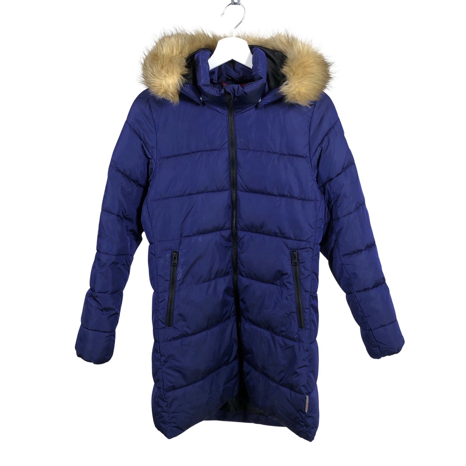 Irrotettava huppu. Irrotettava karvakaulus. Tuotteessa on heijastavia yksityiskohtia. Tuotteen pinnassa on aavistus käyttölikaa. Tuote on muilta osin hyvässä kunnossa.