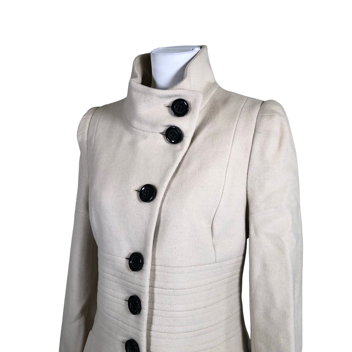 Edessä napit. Villasekoitetta. Tuotteessa on ohut vuori. Tuotteen pinnassa on aavistus pesu-/käyttökulumaa. Yleisilme on siisti.