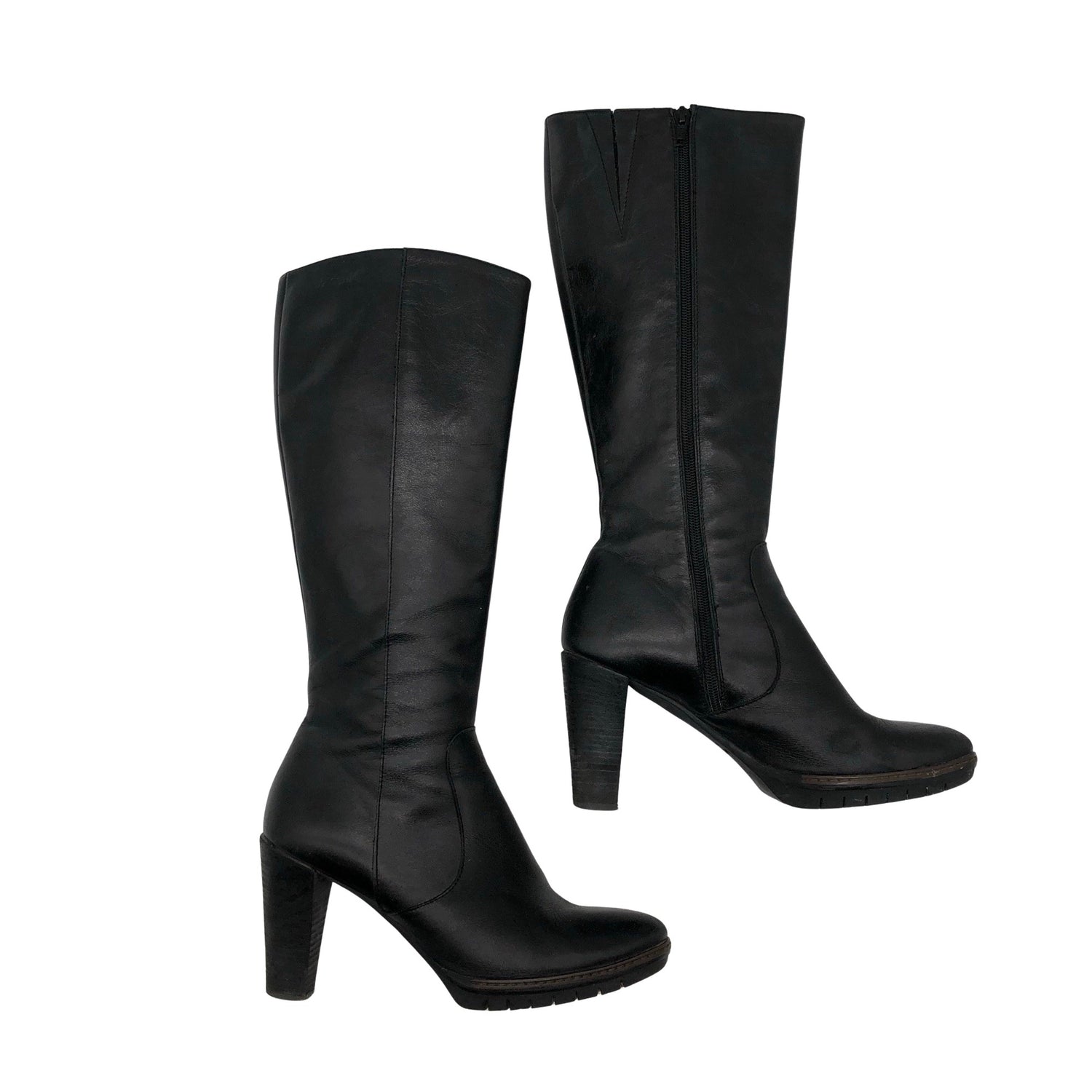Korkeat korot (yli 8 cm). Varsi joustaa hieman. Tuotteessa on vetoketju. Kenkien kärjissä on hieman kulumaa. Tuotteen pinnassa on hieman pesu-/käyttökulumaa. Yleisilme on siisti.