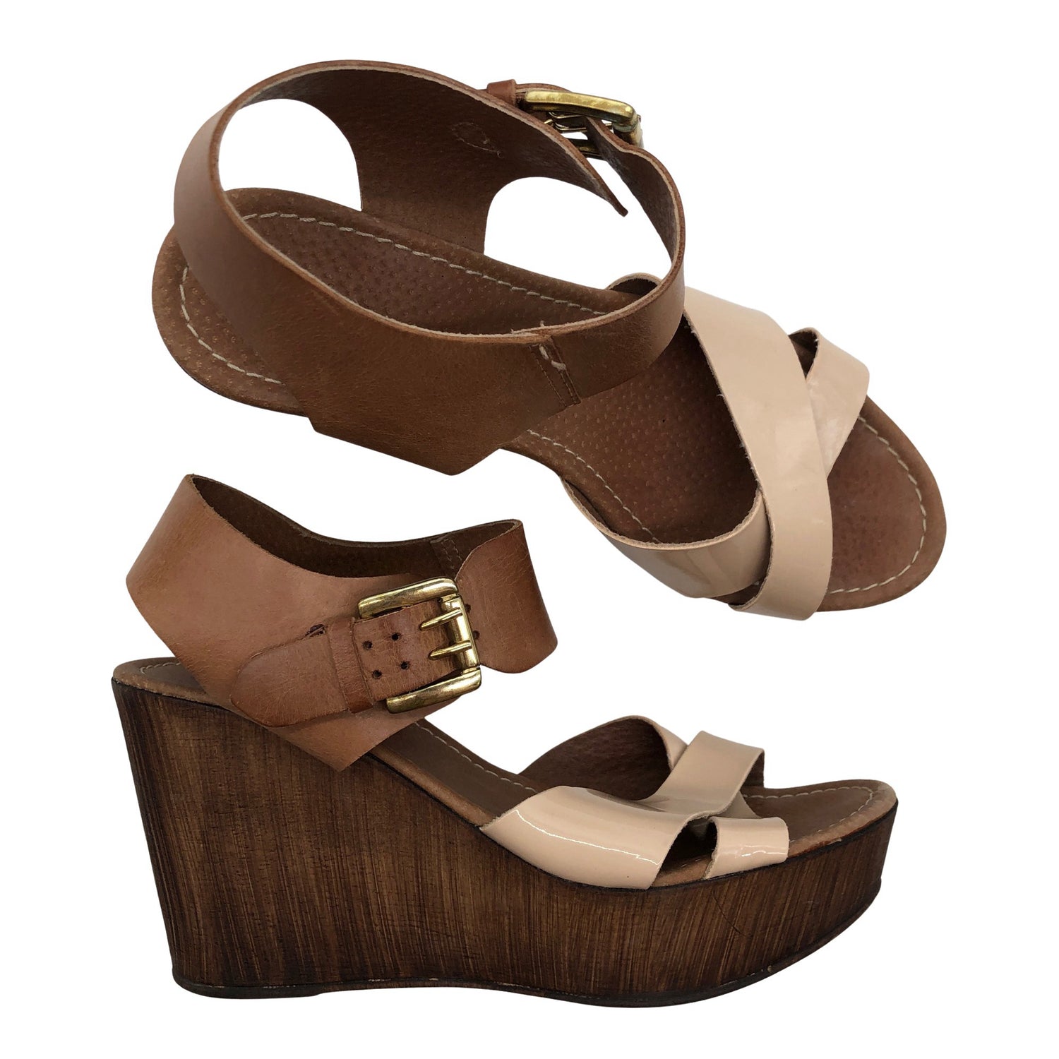Nahkaa. Solkikiinnitys. Korkeat korot (yli 8 cm). Tuotteen pinnassa on hieman pesu-/käyttökulumaa. Yleisilme on siisti.