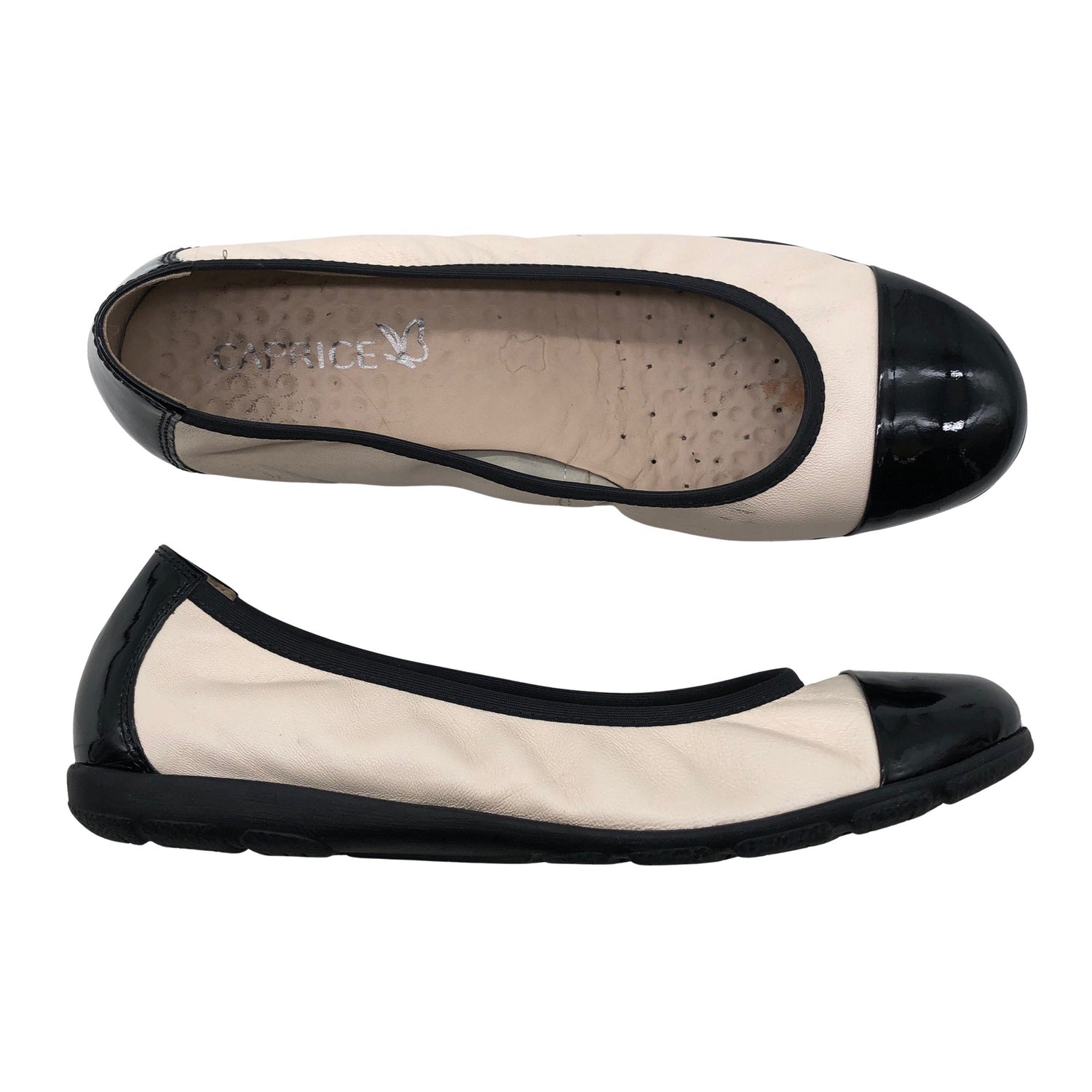 Caprice Ballerinat, koko 37. Nahkaa. Taipuisa pohja. Tuotteen pinnassa on hieman pesu-/käyttökulumaa. Tuotteen sisäpuolella on hieman kulumaa. Yleisilme on siisti.