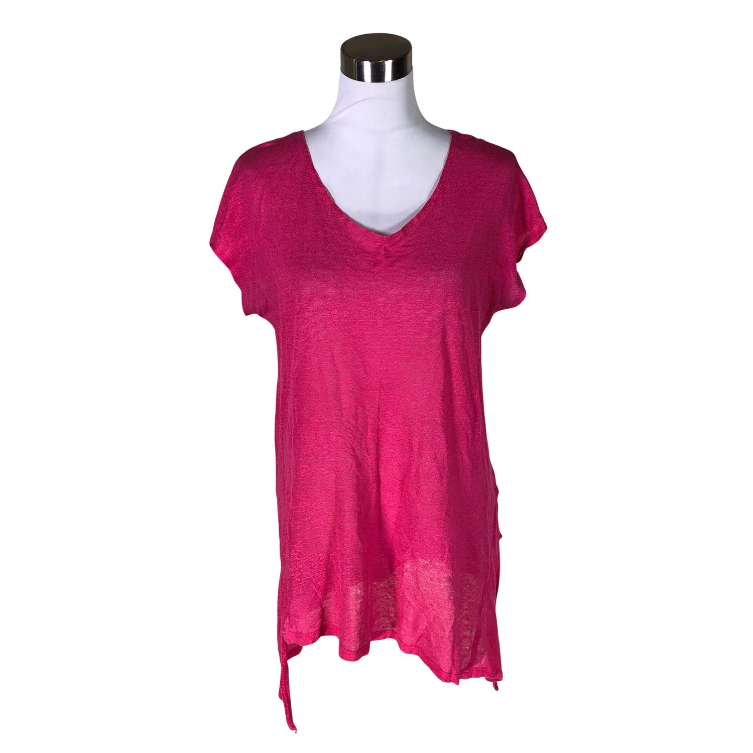 Pellavasekoitetta. Sivusaumoissa on halkiot. Epäsymmetrinen helma. Materiaali joustaa. Tuotteen pinnassa on hieman pesu-/käyttökulumaa. Tuotteen pinnassa on hieman tummentumaa. Tuotteen pinnassa on hieman nukkaa. Yleisilme on siisti.