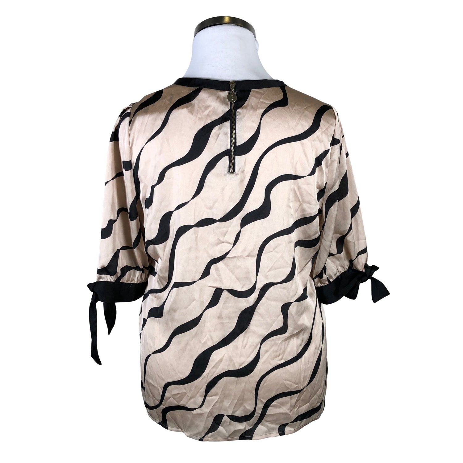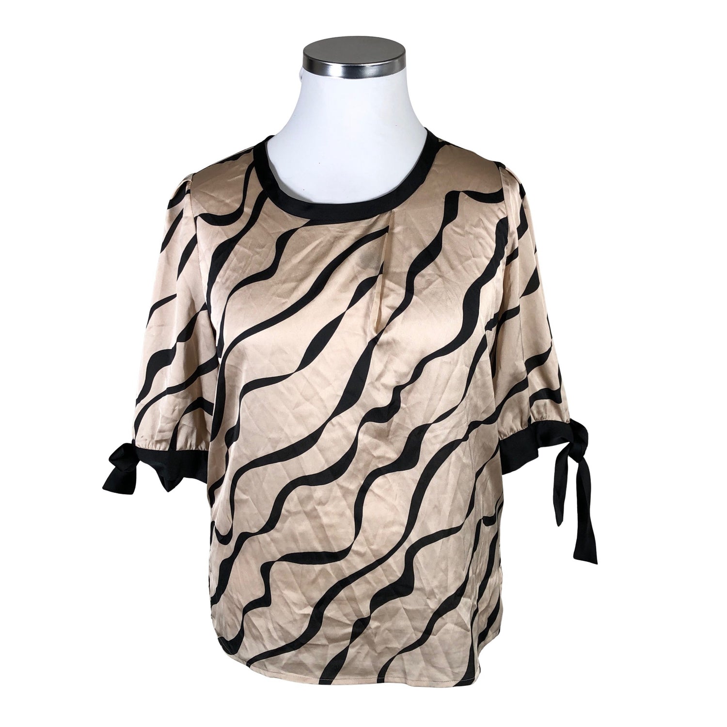 Vetoketju takana. Satiinia. Solmittava malli. Materiaali ei jousta. Tuotteen pinnassa on aavistus pesu-/käyttökulumaa. Yleisilme on siisti.