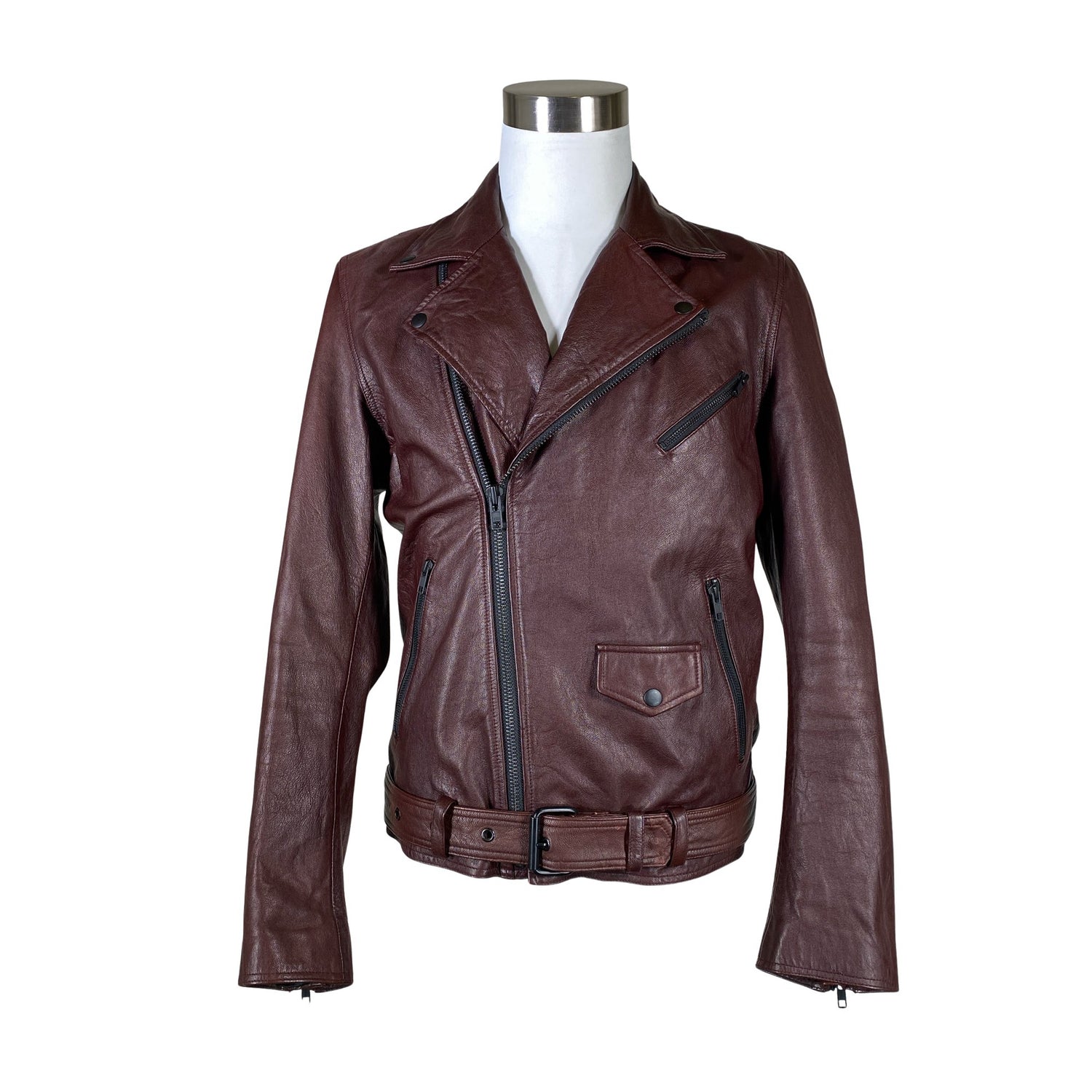 Biker. Tuotteeseen kuuluu vyö. Hihoissa on vetoketjut. Tuotteen pinnassa on aavistus pesu-/käyttökulumaa. Yleisilme on siisti.