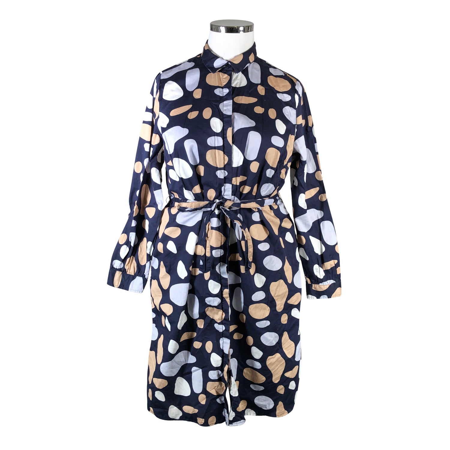 Materiaali ei jousta. Edessä napit. Tuotteeseen kuuluu vyö. Paitamekko. Tuotteen pinnassa on aavistus pesu-/käyttökulumaa. Yleisilme on siisti.