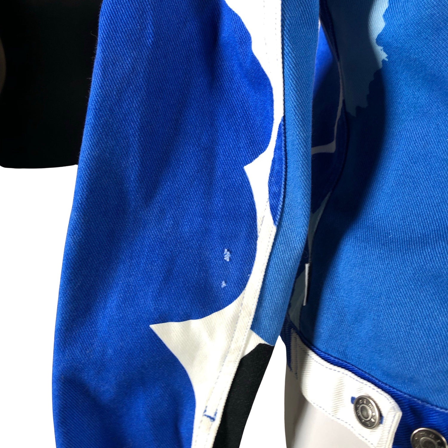 Tuotteen mallitieto puuttuu. Materiaali ei jousta. Kauluksen sisäpuolella on hieman tummentumaa. Hihan- ja/tai lahkeensuissa on hieman käyttölikaa. Tuote vaatii pesun. Tuotteen pinnassa on pieni nirhauma. Katso lisäkuvat. Tuote on muilta osin hyvässä kunnossa.