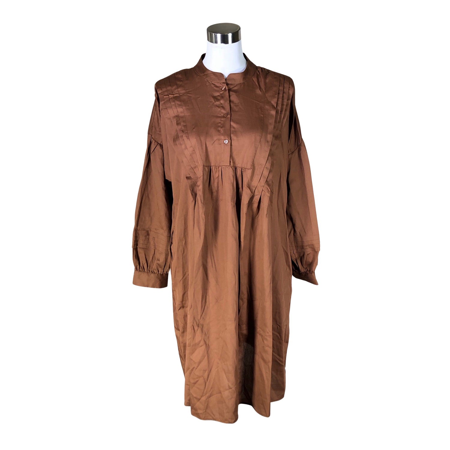 Edessä napit. Vaatteessa on taskut. Langassa on kiiltoa. Materiaali ei jousta. Tuotteen pinnassa on aavistus pesu-/käyttökulumaa. Yleisilme on siisti.