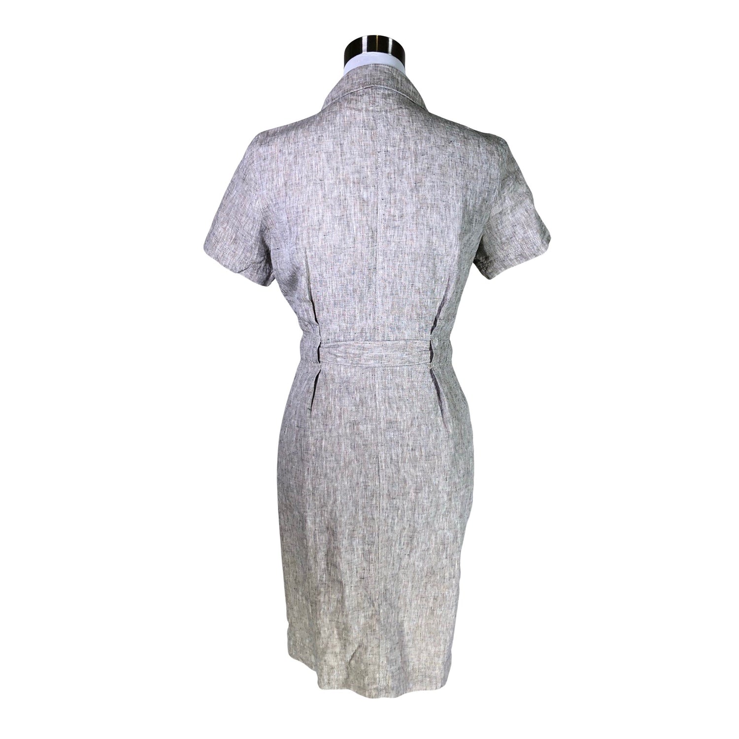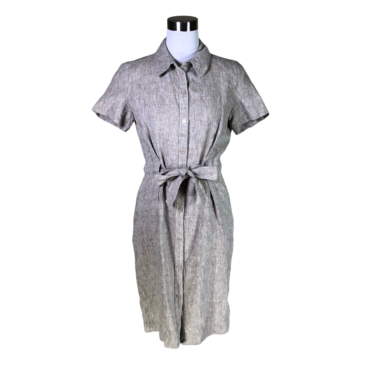 Pellavaa. Edessä napit. Kiristysnauha vyötäröllä. Tuotteessa ei ole taskuja. Materiaali ei jousta. Tuotteen pinnassa on aavistus pesu-/käyttökulumaa. Yleisilme on siisti.