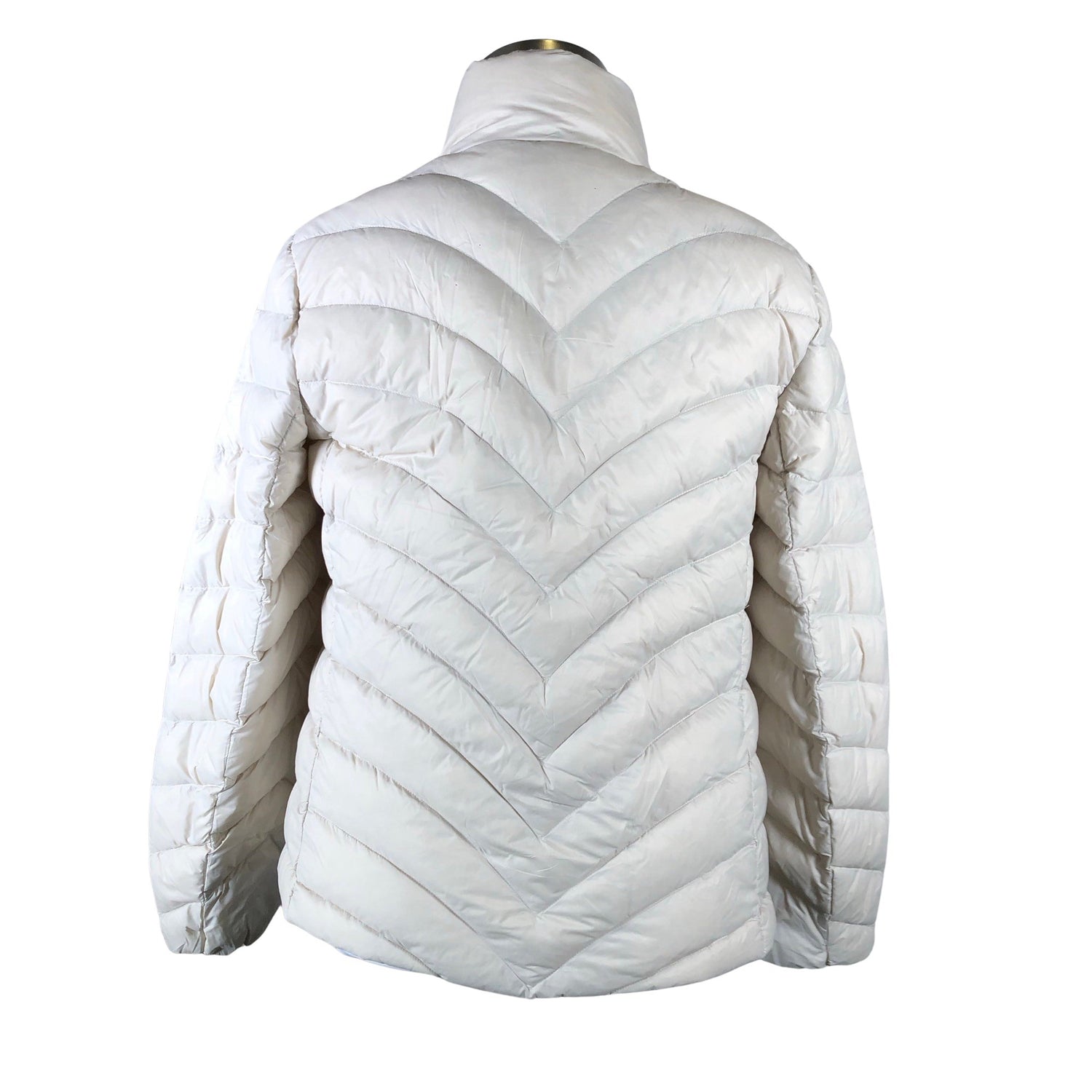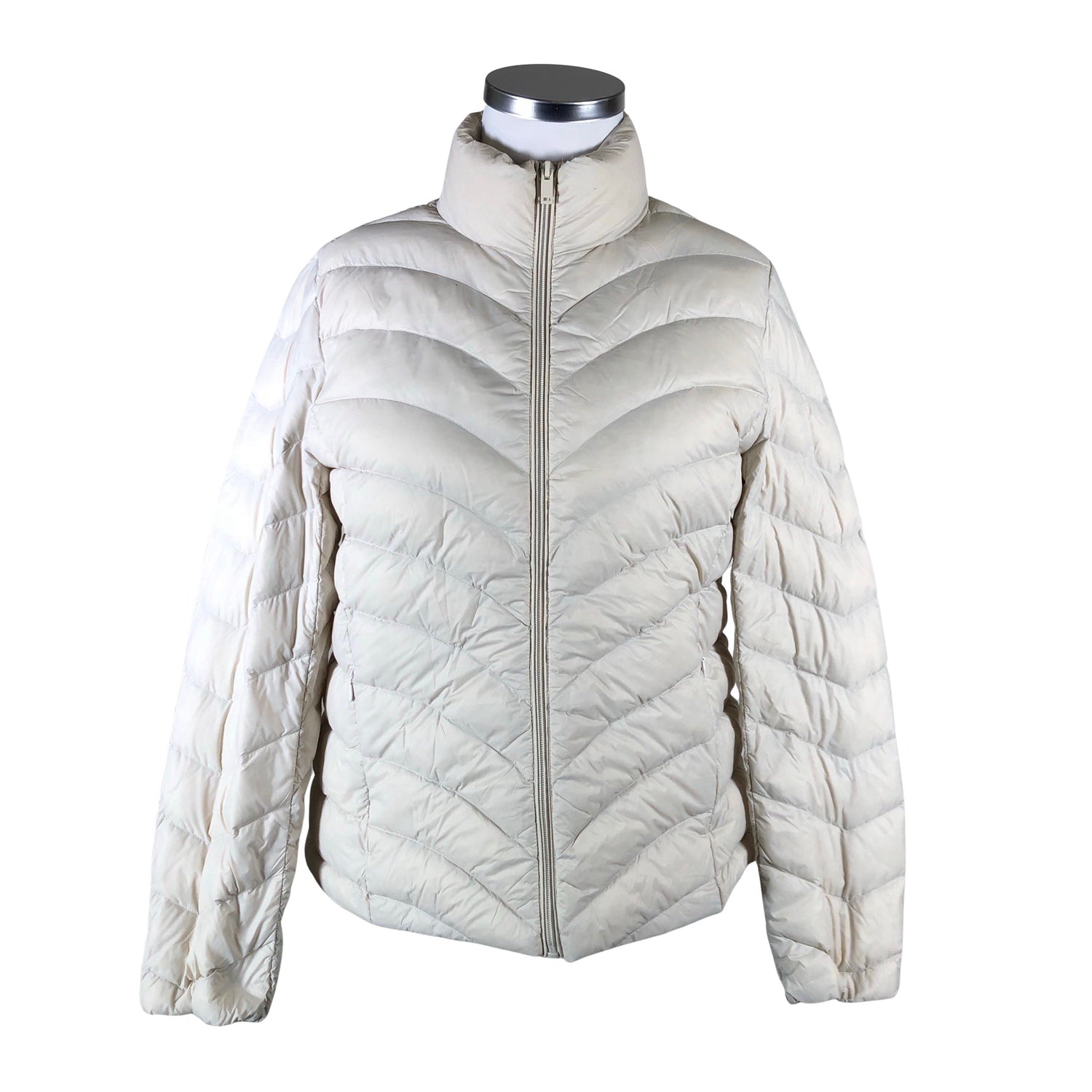 Vaatteessa on taskut. Tuotteen pinnassa on muutama haalea tahra. Toppaus on hieman kasassa.