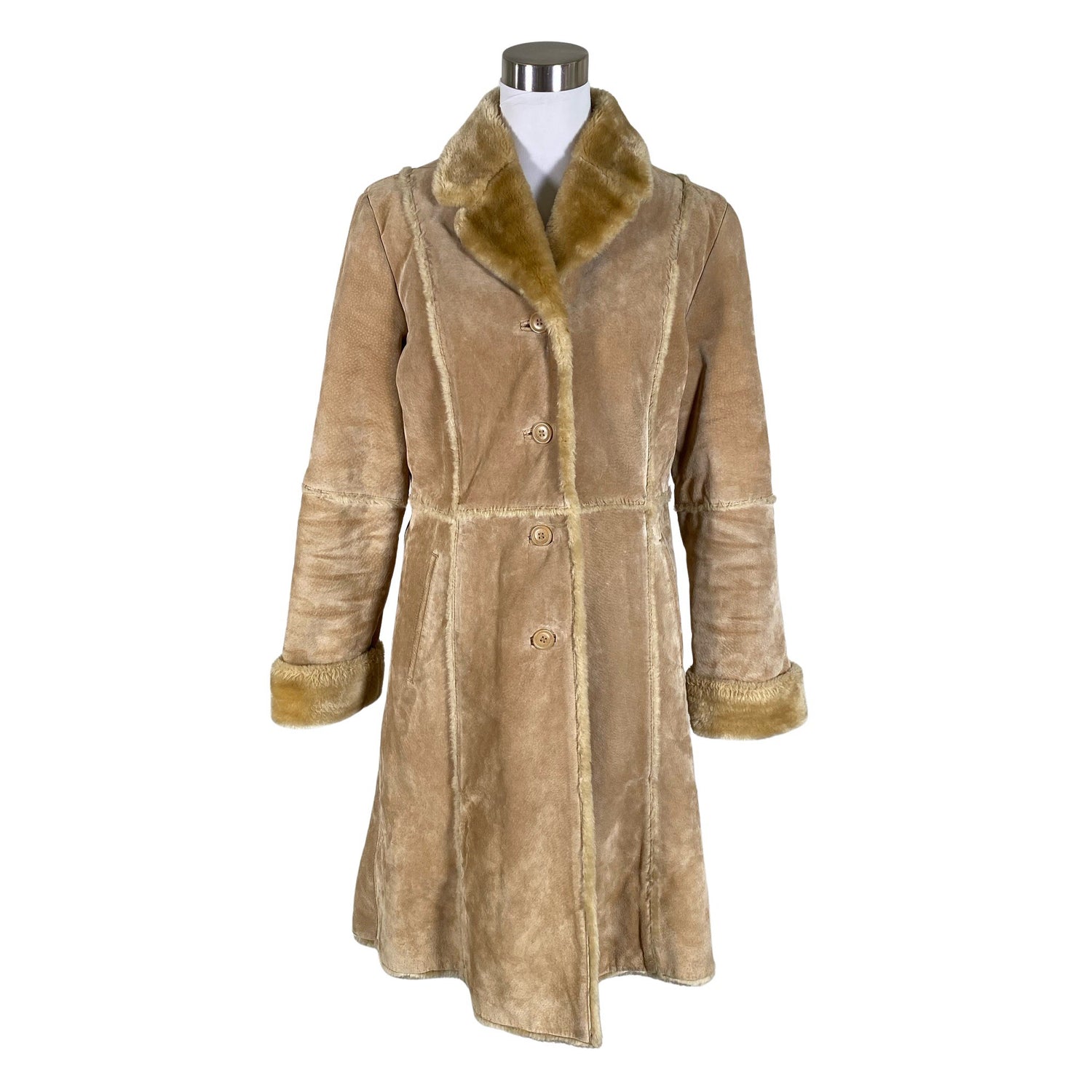 Mokkanahkaa. Karvavuori. Tekoturkista. Vaatteessa on taskut. Paksua materiaalia. Tuotteen pinnassa on hieman pesu-/käyttökulumaa. Tuotteen pinnassa on aavistus tummentumaa. Yleisilme on siisti.