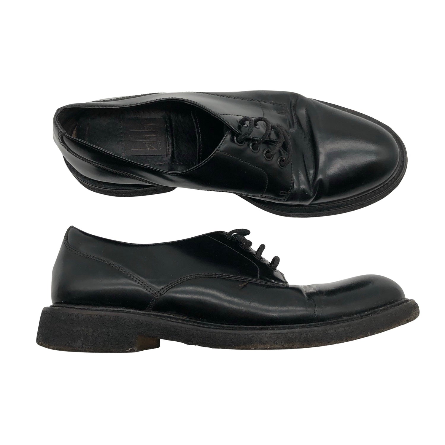 Solmittava malli. Kiiltonahkaa. Tuotteen pinnassa on hieman pesu-/käyttökulumaa. Yleisilme on siisti.