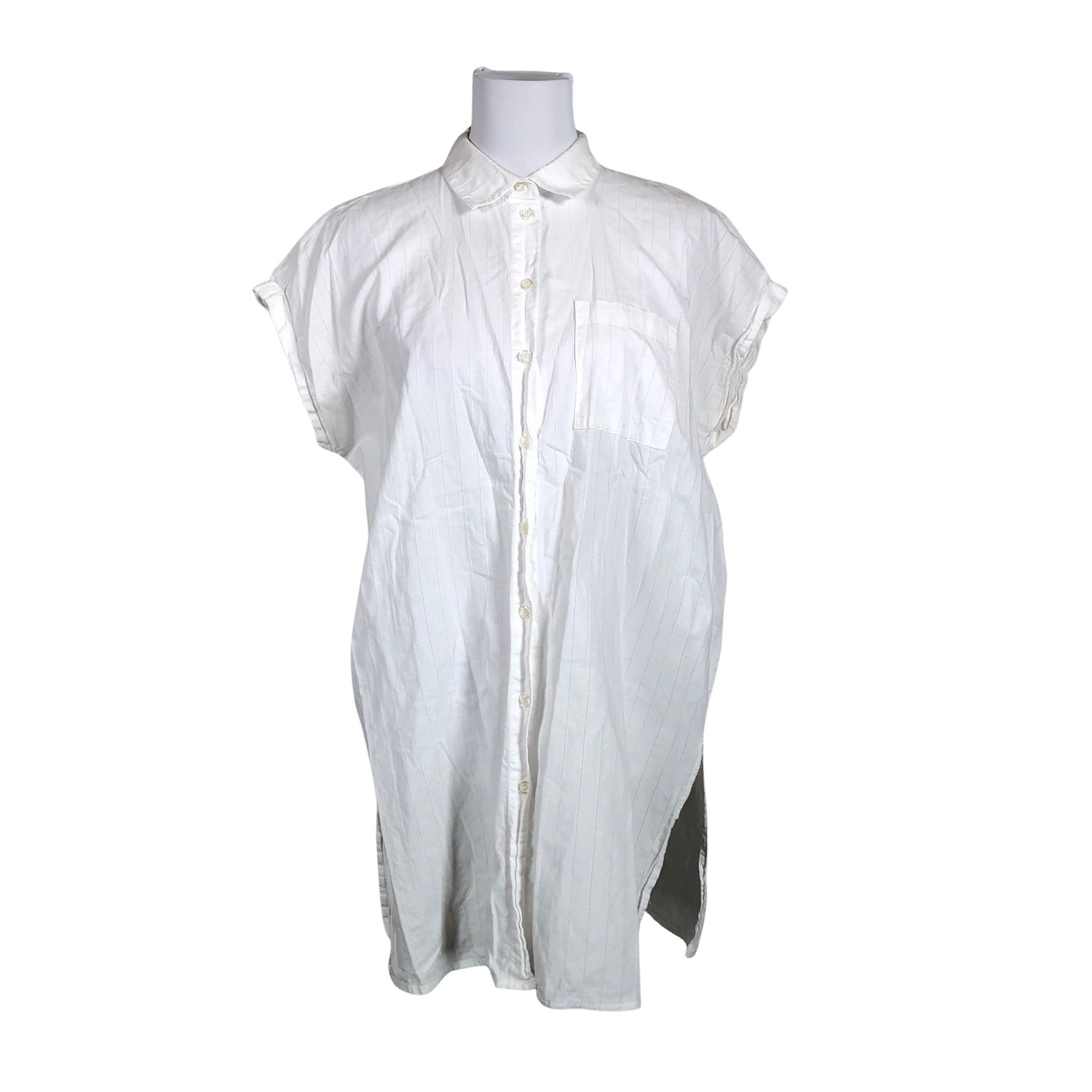Malli: Koru. Puuvillaa. Materiaali ei jousta. Sivusaumoissa on halkiot. Kauluksen sisäpuolella on aavistus tummentumaa. Tuotteen pinnassa on hieman tummentumaa. Yleisilme on siisti.