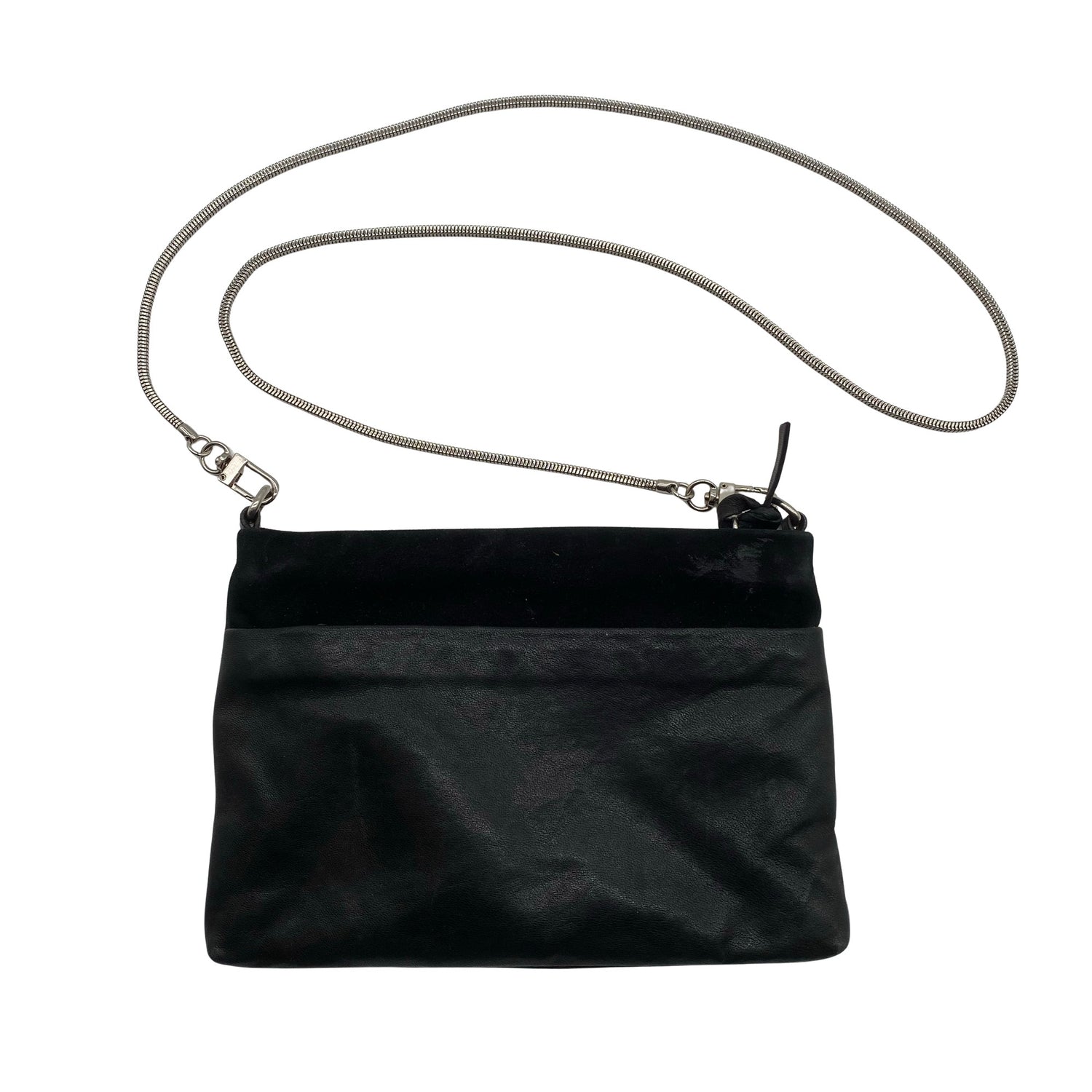 Materiaalitieto puuttuu. Todennäköisesti nahkaa. Irrotettava olkahihna/rannelenkki. Tuotteen pinnassa on pieni nirhauma. Laukun kulmissa on aavistus kulumaa. Tuotteen pinnassa on aavistus pesu-/käyttökulumaa. Yleisilme on siisti.