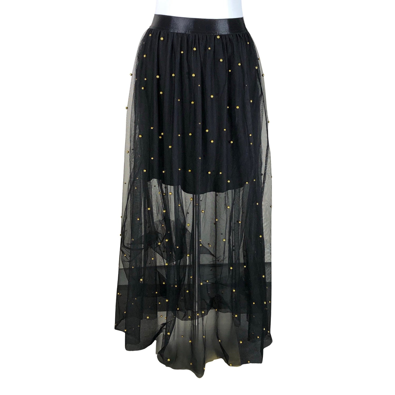 Vaatteen mitta: rinnanympärys 1/2 mitta (kainalo-kainalo): 49 cm. Olka-helma pituus: 58 cm. Setti. Malli: Hellene blouse & Venus skirt. Läpikuultava kangas. Tylliä. Kultaiset metallisosat.