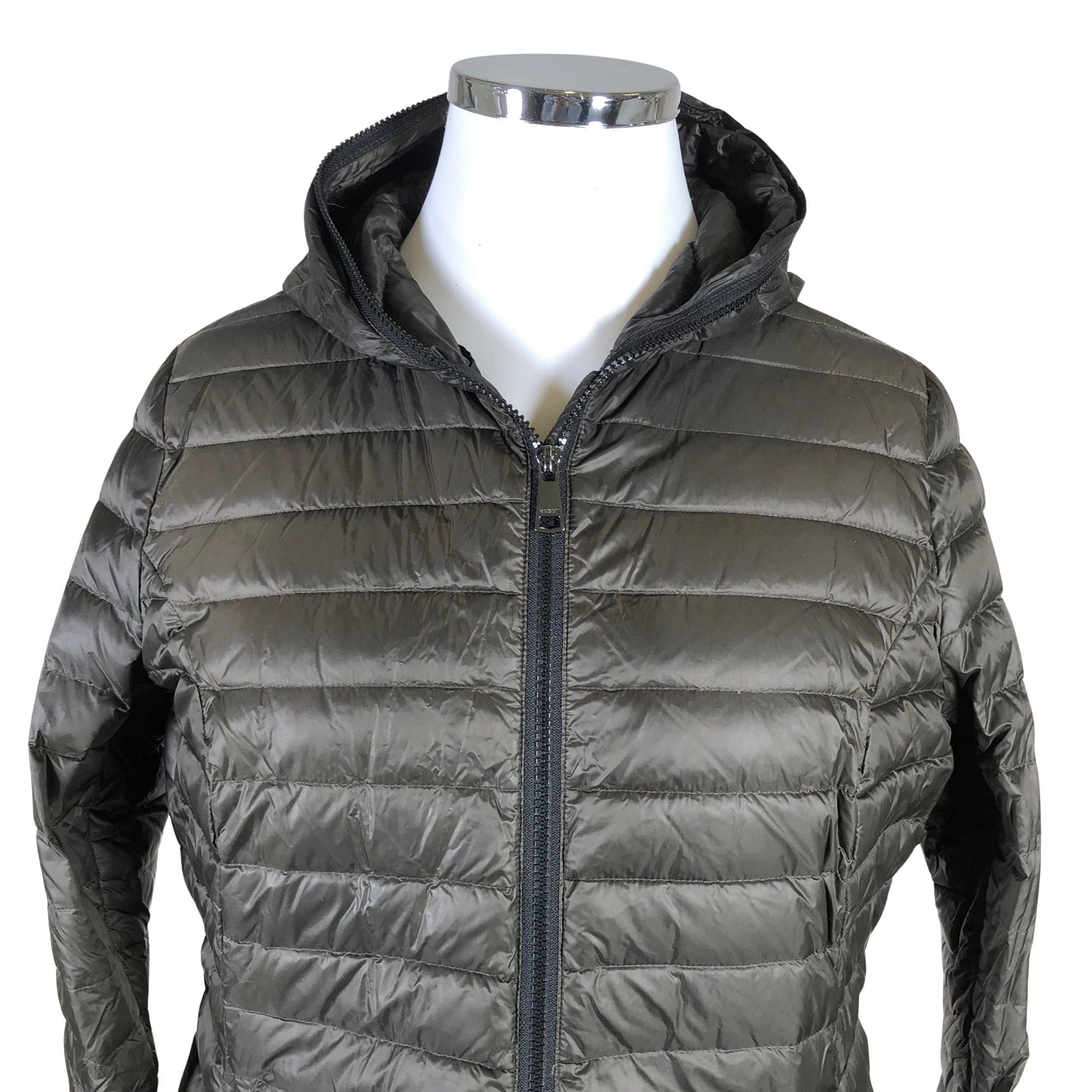 Kevyttä materiaalia. Tuotteessa on kaksisuuntainen vetoketju. Kauluksen sisäpuolella on aavistus tummentumaa. Tuote on muilta osin hyvässä kunnossa.