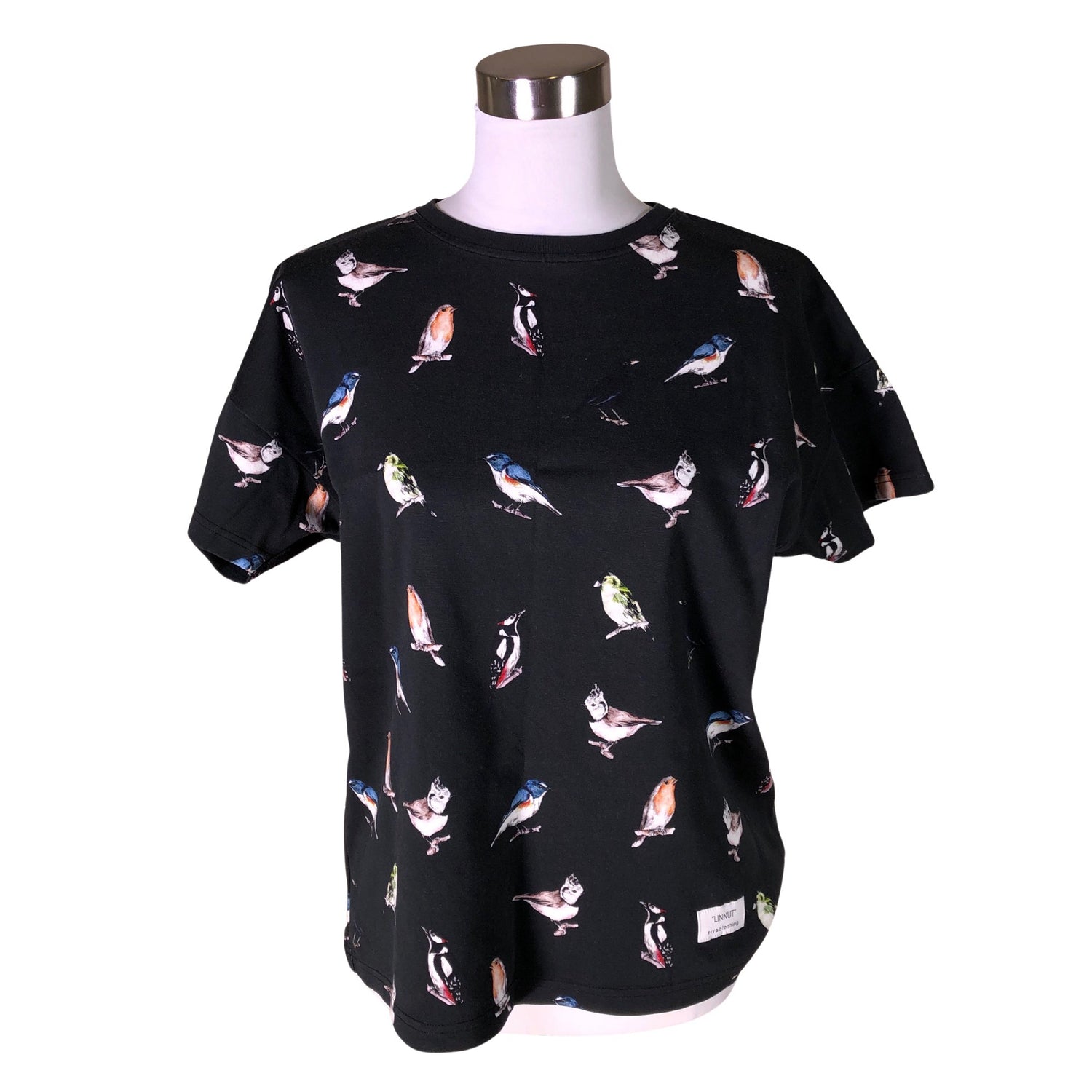 Malli: Linnut. Tuotteen pinnassa on aavistus pesu-/käyttökulumaa. Yleisilme on siisti.