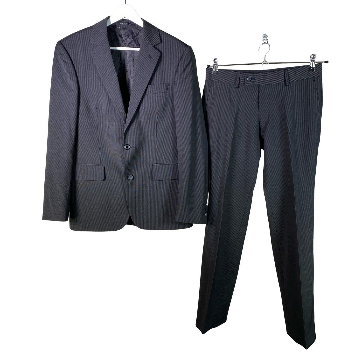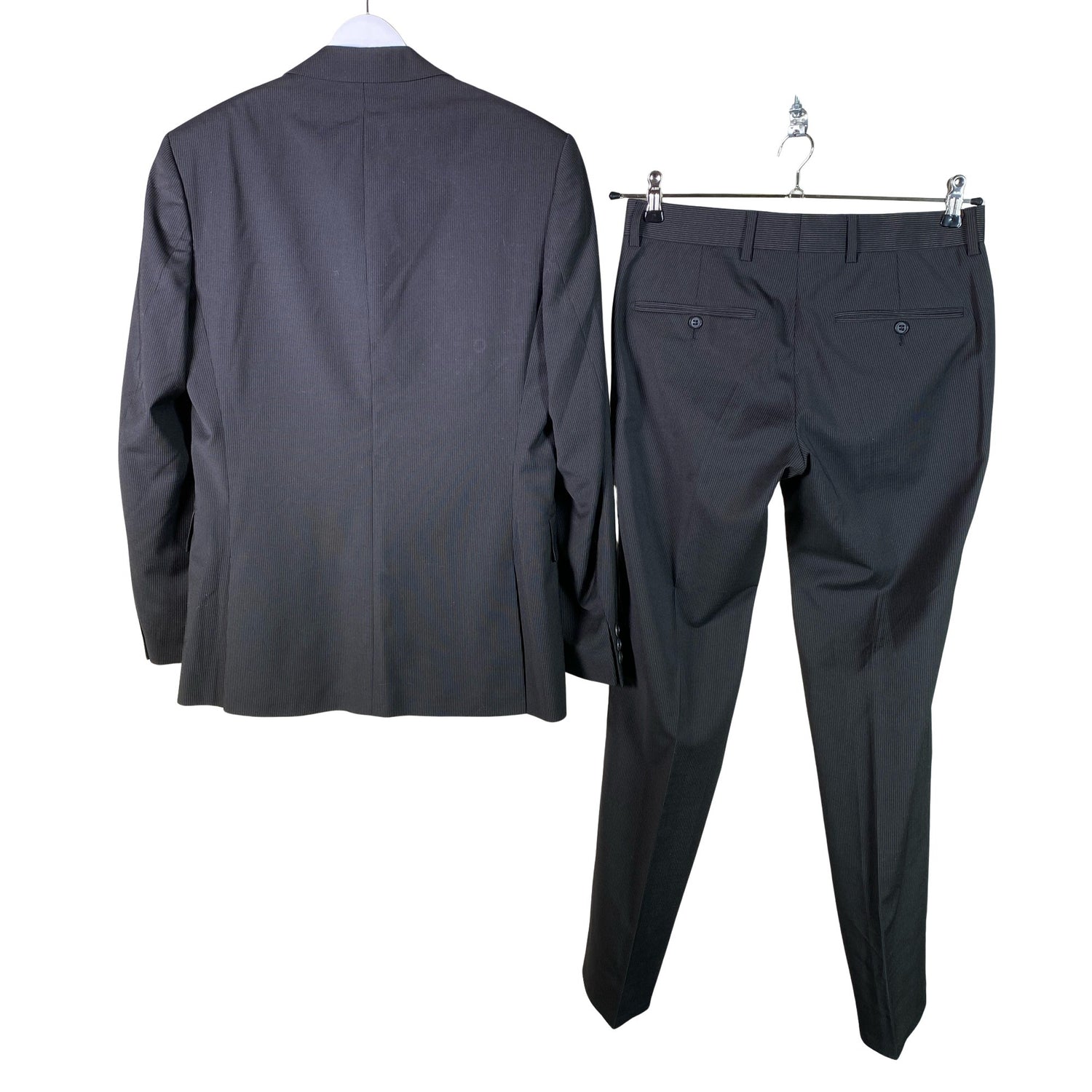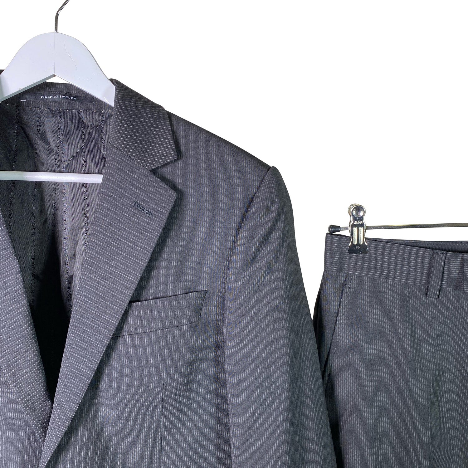 Villasekoitetta. Tuotteessa on ohut vuori. Liituraitakuosi. Materiaali ei jousta. Tuotteen pinnassa on aavistus pesu-/käyttökulumaa. Yleisilme on siisti.