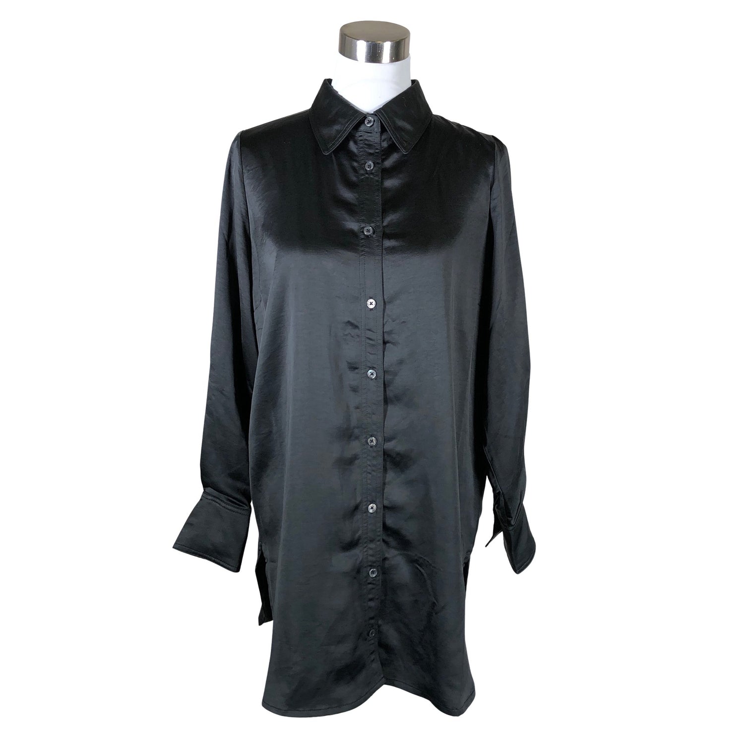 Langassa on kiiltoa. Edessä napit. Pyöristetty helma. Materiaali ei jousta.