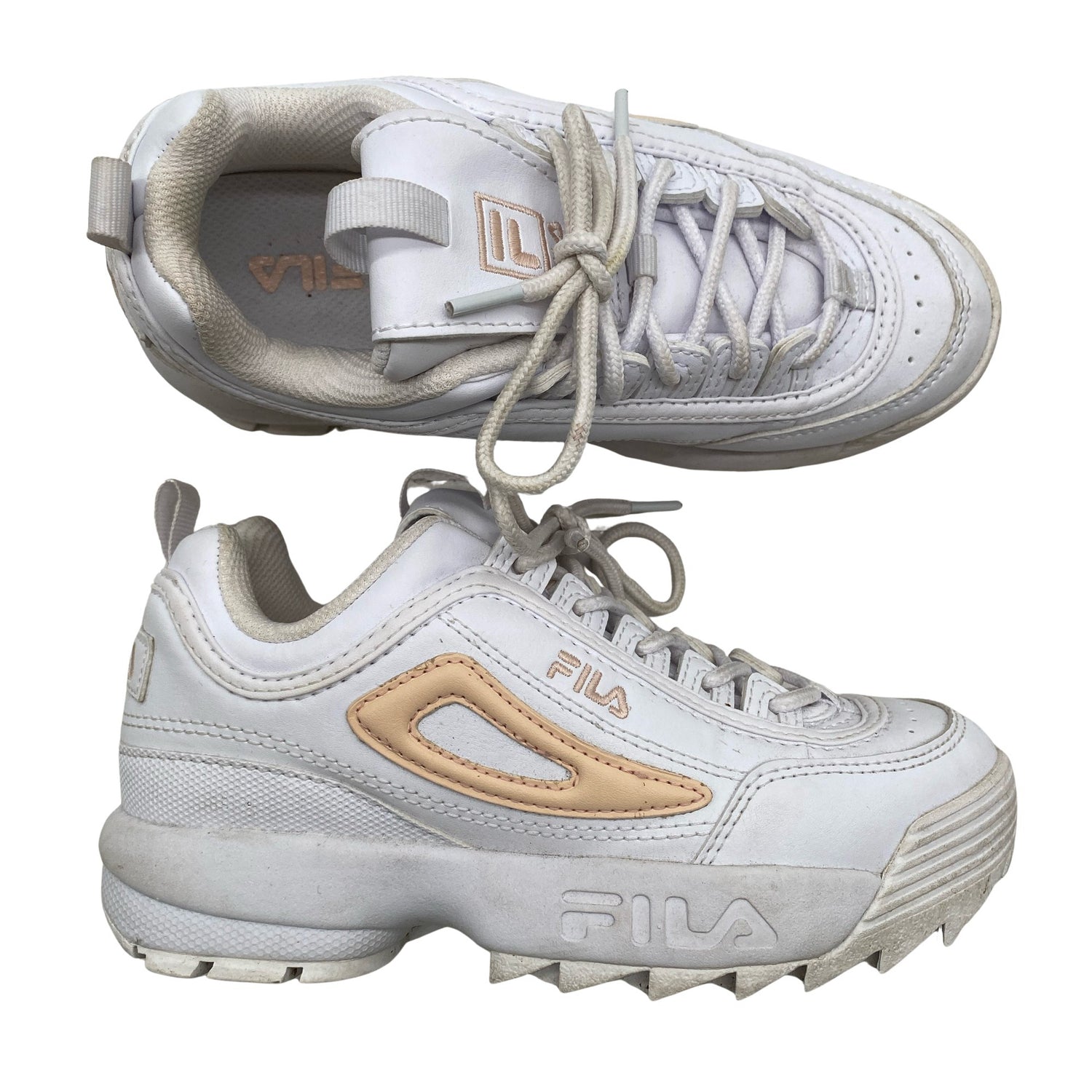 Fila Tennarit, koko 35. Materiaalitieto puuttuu. Todennäköisesti keinonahkaa. Solmittava malli. Tuotteen pinnassa on hieman käyttölikaa. Lähtee todennäköisesti pesussa. Tuote on muilta osin hyvässä kunnossa.
